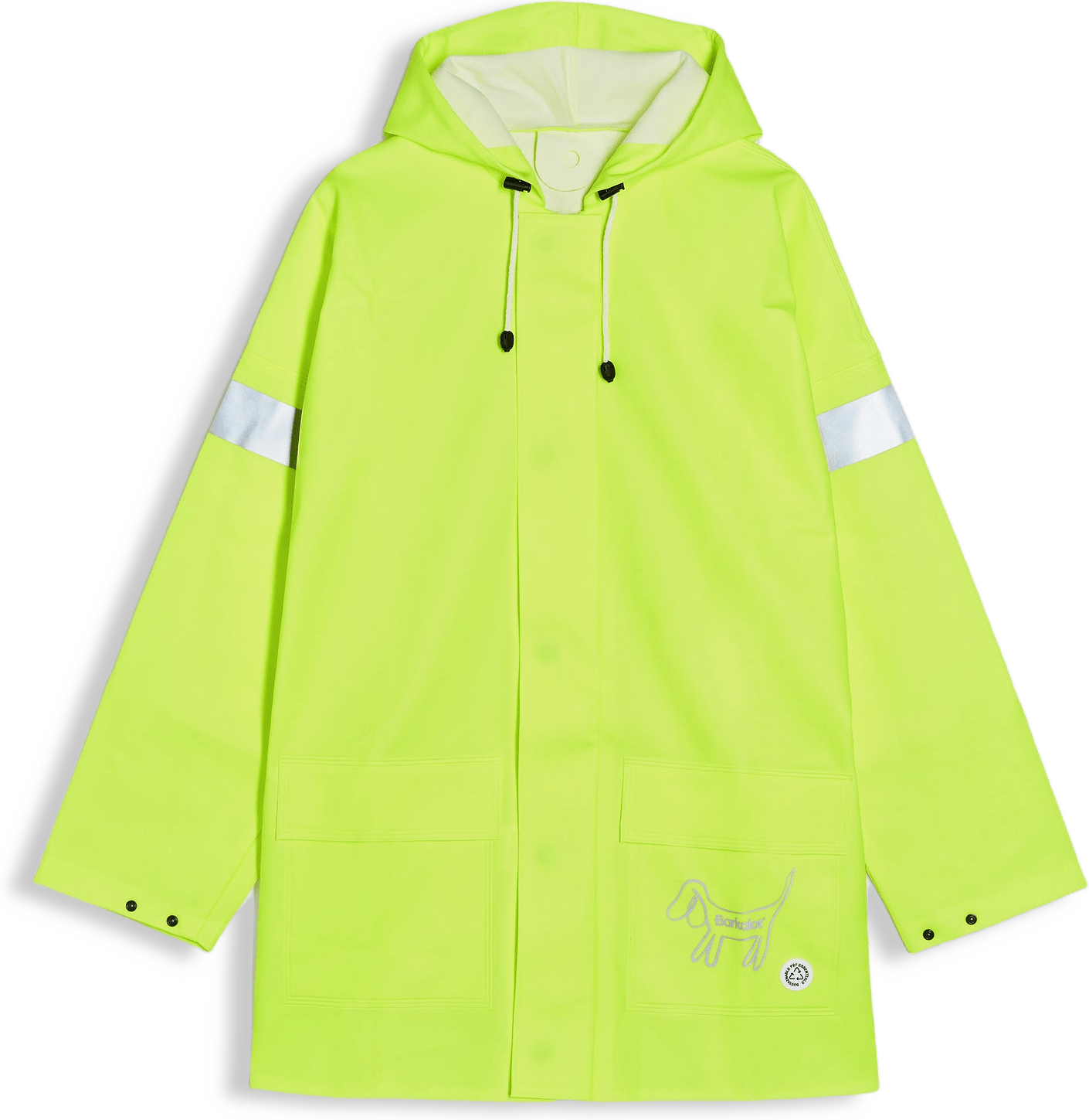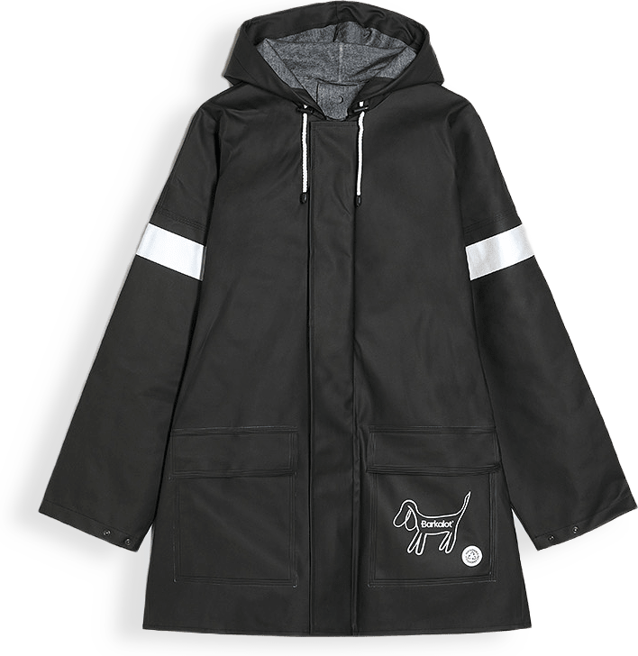 Vår regnrock är gjord av återanvänt PVC-material. Den har reflekterande logotyp och reflextejp på ärmarna för synlighet. Den har en dragkedja och knappslå på framsidan, tillsammans med lock över fickorna för att förhindra att vatten kommer in på oönskade ställen.