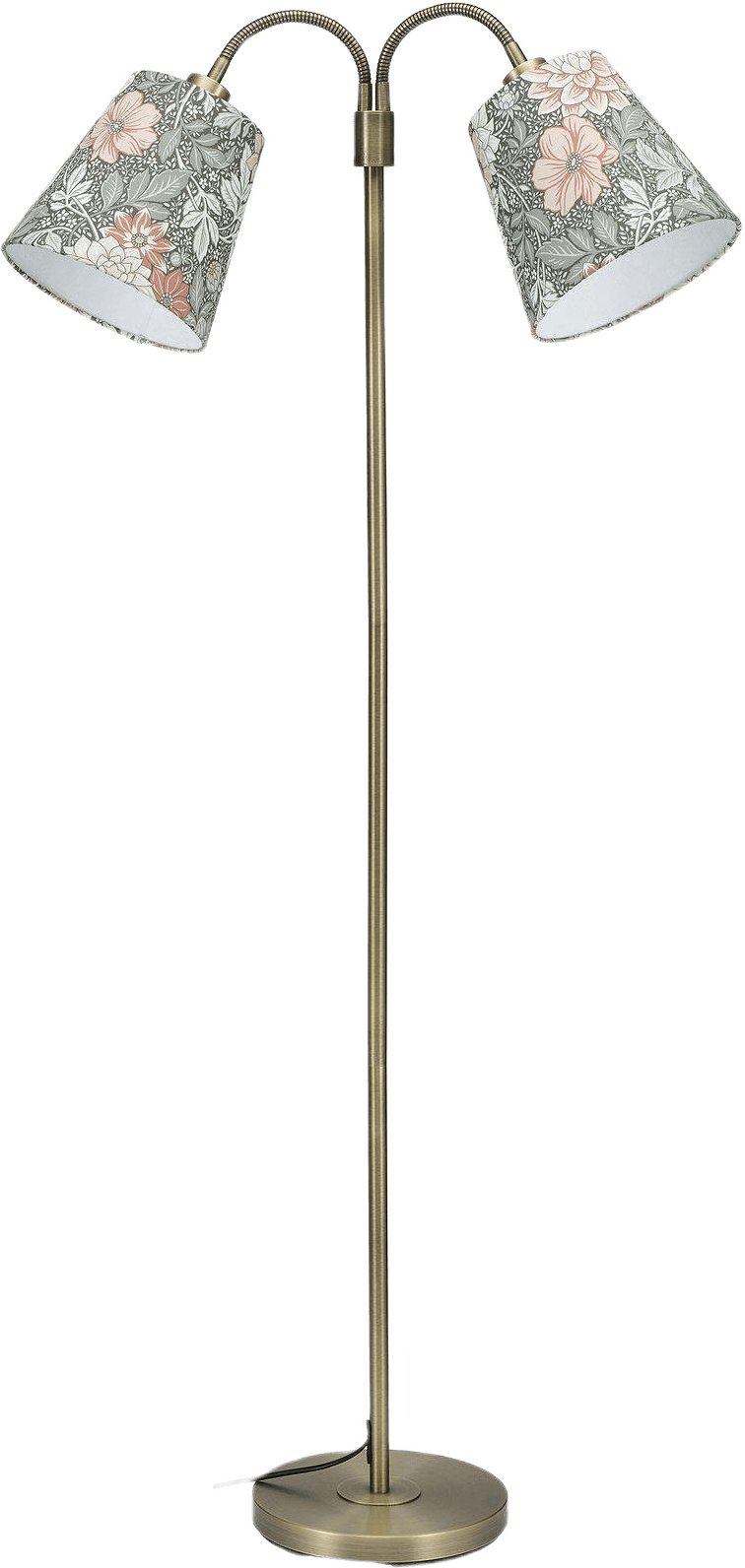 Enkel och stilren golvlampa i metall med två justerbara armar med lampskärm Dahlia Garden i grön/mildrosa färgställning. Handmålat mönster av designern Jenny Hahne Gadd för Boråstapeter. Låt de praktfulla dahliorna och sirliga bladen flytta in i ditt rum.