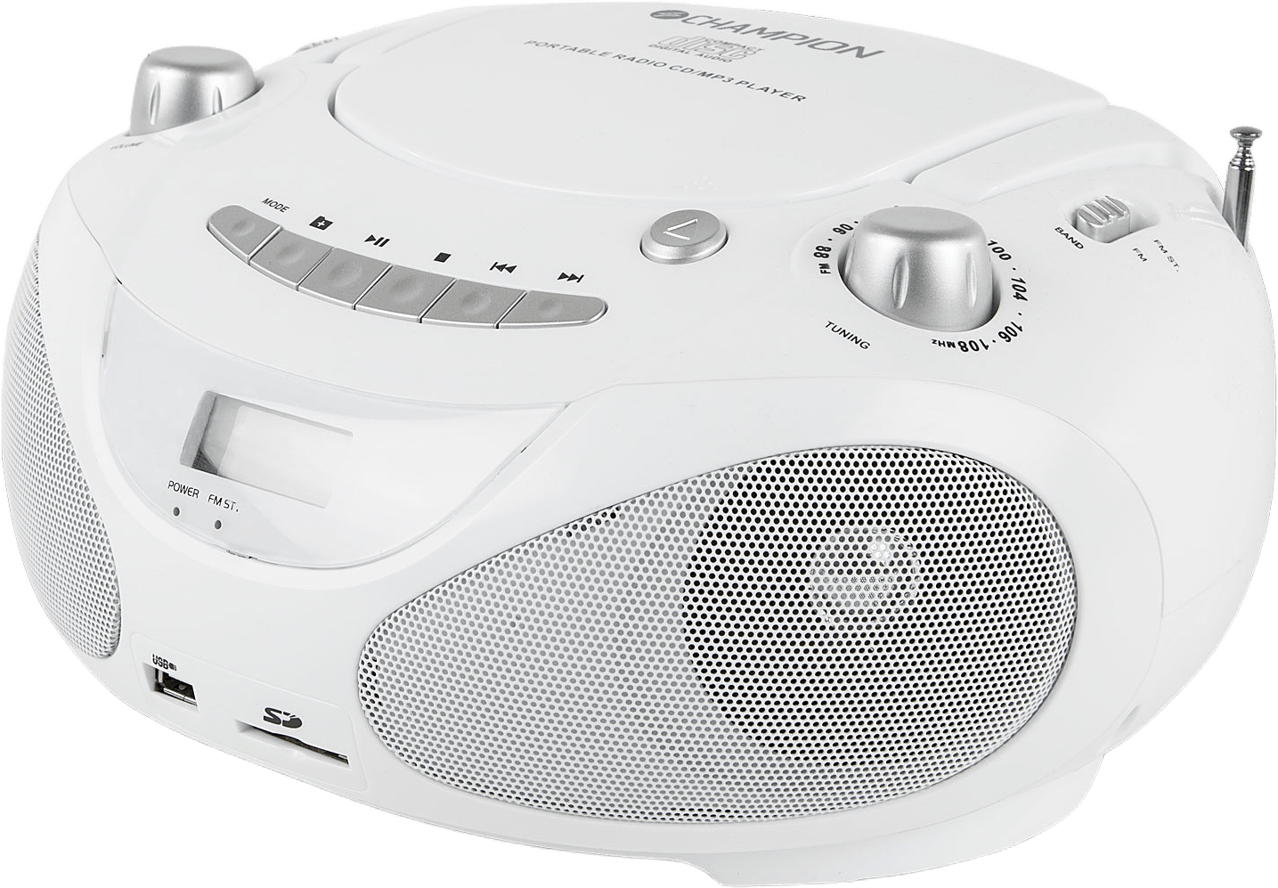Champions bärbara boombox gör det enkelt att lyssna på din favoritmusik. Du kan välja mellan att spela upp musik från CD, FM-radio, USB eller anslut din smartphone/MP3-spelare med hjälp av en AUX inkoppling. Champions boombox har en tydlig display och drivs via antingen nätadapter eller 8 x C-batterier. Detta innebär att den fungerar lika bra i hemmet som på uteplatsen.