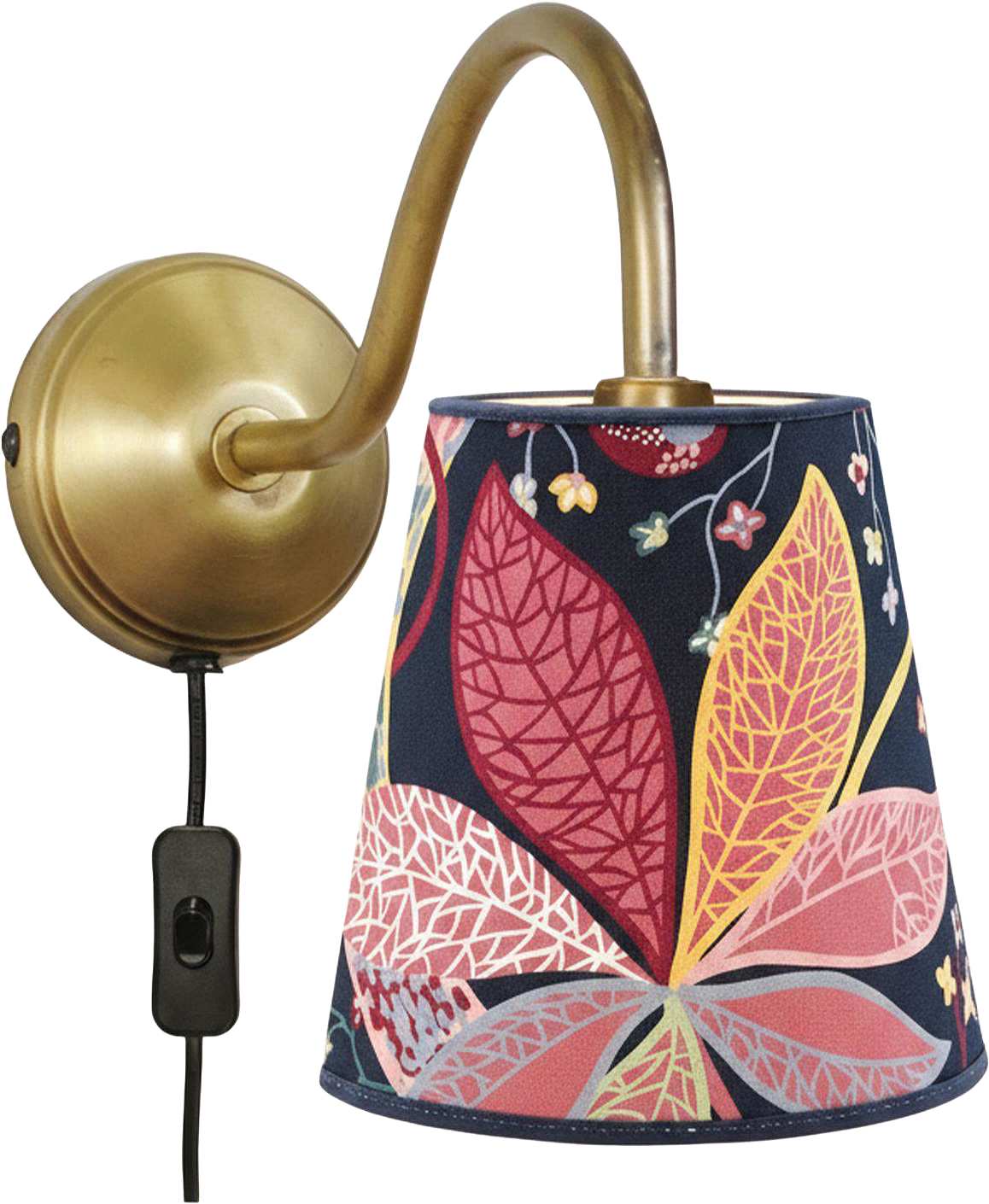 Ester vägglampa med skärm i dekorativt blommönster. Väggfäste Ester är ett elegant och tidlöst väggfäste med ett böjd, fast vinklad arm i metall med en vacker finish i antikmässing som ger en klassisk vintagekänsla och passar perfekt i både moderna och traditionella inredningar, den har en 2 meter lång svart textilkabel med integrerad strömbrytare och väggkontakt vilket gör den enkel att installera och använda, lampans arm har ett utskjut på 31 cm från väggen och väggfästets diameter är 10 cm vilket ger ett stabilt och dekorativt intryck, utrustad med E27 lamphållare och max 25W vilket gör den idealisk för en klar klotformad LED-ljuskälla som sprider ett behagligt ljus i rummet, klassificerad med IP20 vilket passar för torra inomhusmiljöer. Lampskärm Cia i ett mönstrat bomullstyg. Lampskärmen har en ljus insida, samt E27 toppring.