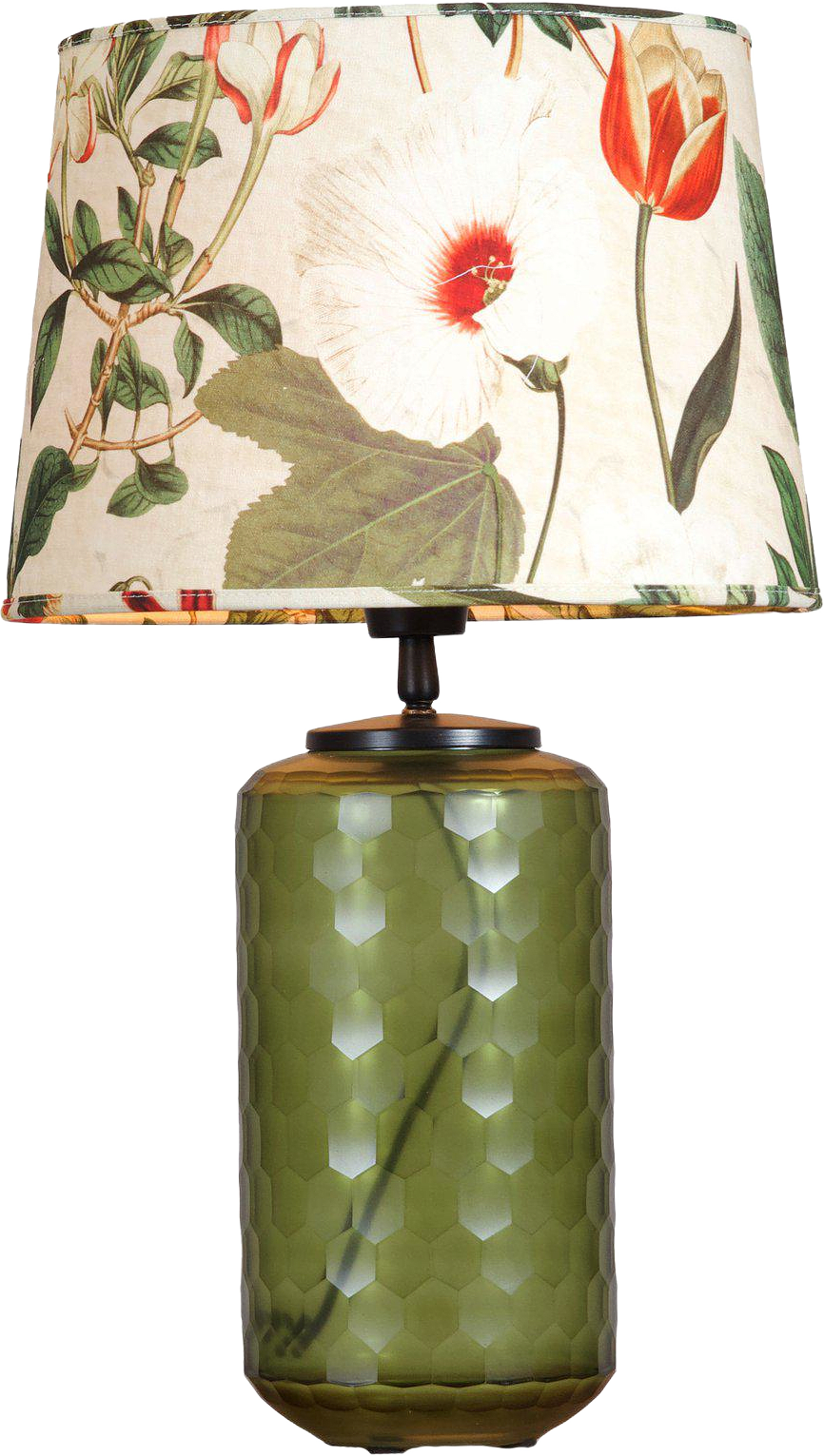 Gabby lampa i handblåst grönt glas med matchande lampskärm. Den djupa gröna färgen i kombination med det vågade mönstret skapar ett vackert ljusspel i rummet. Metalldetaljer i matt svart och en 2 meter lång svart sladd med strömbrytare. E27 sockel, max 40W. Lampskärm Sofia i ett mönstrat bomullstyg. Skärmen ger ett fint sken och kan kombineras med många olika lampfötter. E27 ringfäste. Ljuskälla E27 köpes separat.