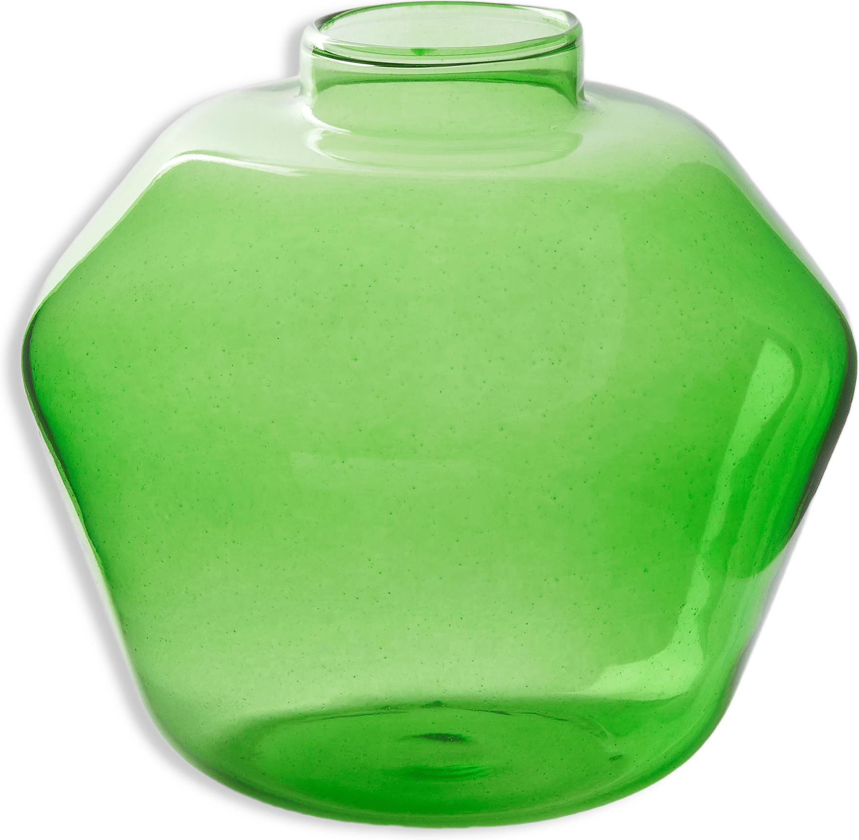 Är inte en grön glasvas utan genomskinligt glas med grön plast på som lossnade. Köp inte!