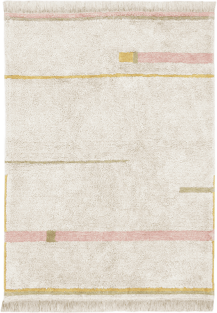 Tvättbar matta inspirerad av ett mönster av breda och smala gränder. Mattan leker med olika lugghöjder, där den längre mjuka plyschan i naturfärg kombineras med kontrasterande färgade linjer i extra korta lugg. Avslutas med fransar i kanterna.