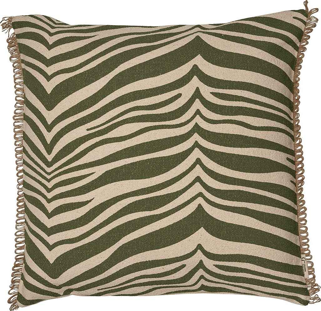 Kudde Zebra är en elegant zebramönstrad kudde med tryck på offwhite bomull, dekorerad med en franskant i jute. Den är tillverkad av 100% bomull med ett handtryckt mönster, och har en enfärgad baksida samt blixtlås i sidan. Innerkudden ingår.