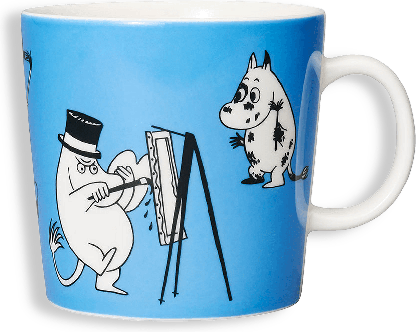 • Blå: I illustrationen på muggen Blå ser vi hela Muminfamiljen som håller på med konst. Mumintrollet gör bokstäver och han har på något vis lyckats kladda ner sig med färg. Muminmamman skapar bilder av sig själv och Muminpappan målar med oljefärger. Muminmuggen Blå i Teema-form finns nu i en ny, större 0,4 L storlek.