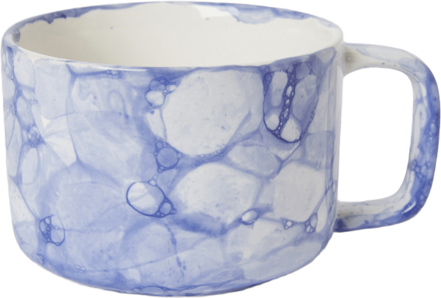 Mugg i blått med raka kanter och öra, ett vackert inslag till det dukade bordet.