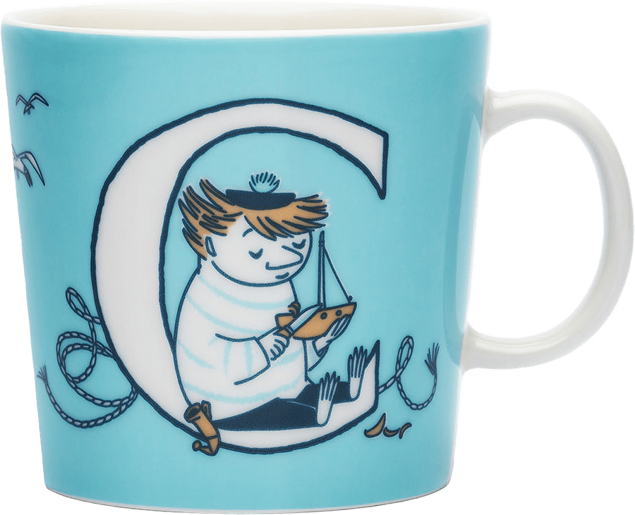 Blå C: På C-muggen har Too-Ticki och mumintrollen hissat segel för ett nytt äventyr. Ute till havs går en familj Klippdassar ombord på fartyget. En av dem biter av trossen men får stanna som ny besättningsmedlem. Illustrationerna är baserade på serien Mumin till sjöss. Moomin Arabia mugg 0,4 l.