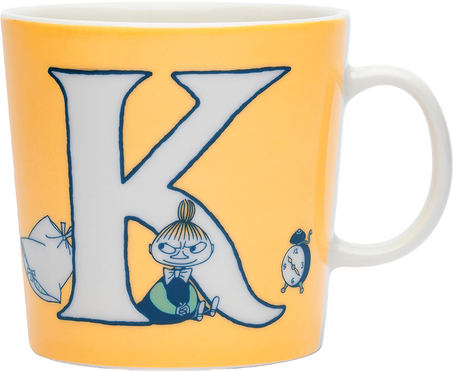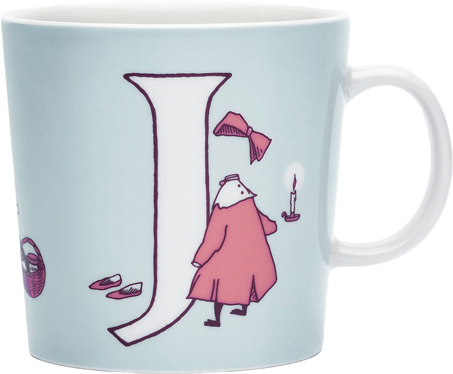 Ljusblå J: På J-muggen har Muminmamman sytt en klänning och ett hårband åt Ninni, det osynliga barnet, för att göra henne mer märkbar. Illustrationerna är baserade på novellsamlingen Det osynliga barnet och boken Pappan och havet.