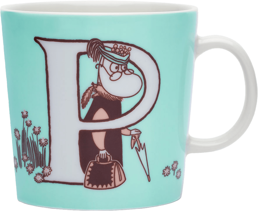 Turkos P: På P-muggen skickar mumintrollen ett paket med fula ord till moster som ett skämt. Detta gör henne rasande och hon bestämmer sig för att besöka dem. Hon mutar Sniff med pengar för att avslöja var mumintrollen befinner sig. Illustrationerna är baserade på serien Muminfamiljen.