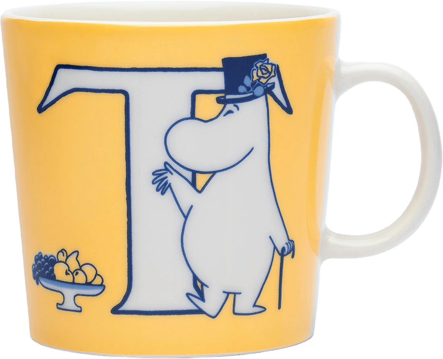 Gul T: På T-muggen har Muminpappan roligt på ett cocktailparty hos de rika. Det har växt ut en gyllene hårtuss på Mumintrolletsskalliga svans. Faktum är att svansen är anledningen till att mumintrollen blev inbjudna till festen överhuvudtaget. Illustrationerna är baserade på serien Mumin och den gyllene svansen.