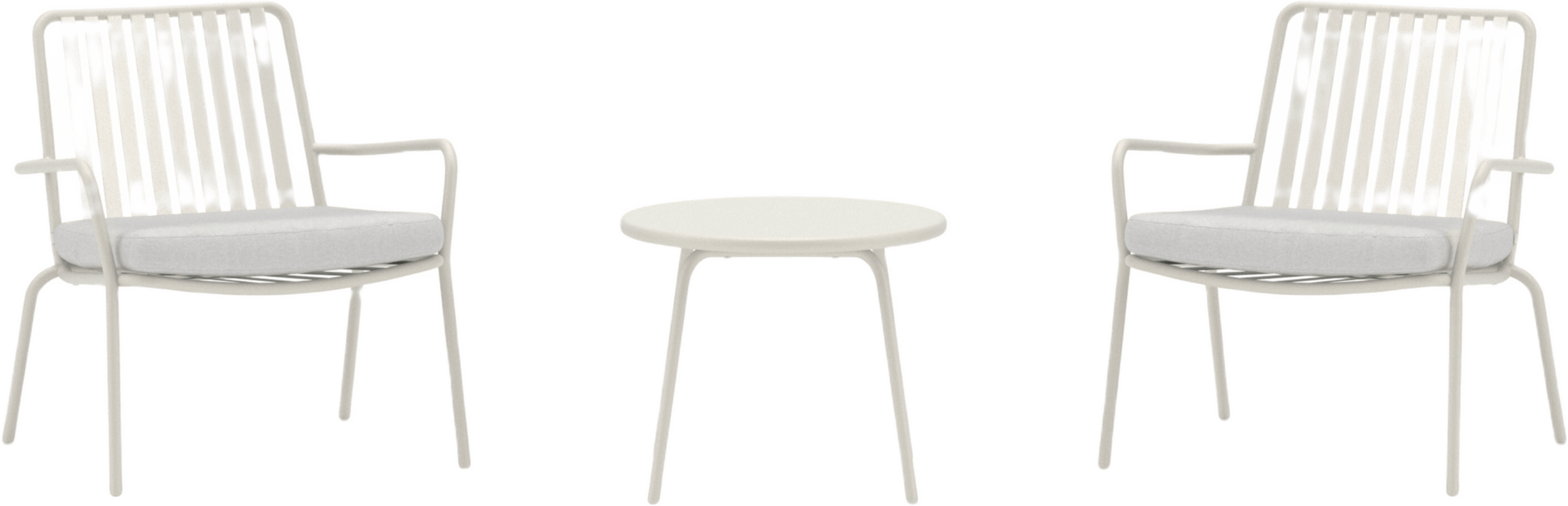 Mykonos loungegrupp i beige är en stilren och inbjudande möbelgrupp som passar perfekt för avkoppling på uteplatsen, balkongen eller i trädgården. Gruppen består av två bekväma fåtöljer med mjuka dynor och ett smidigt bord i matchande design. Den luftiga ramen ger ett modernt uttryck, samtidigt som de neutrala tonerna gör att gruppen enkelt smälter in i olika miljöer. Mykonos loungegrupp är det självklara valet för dig som vill skapa en avslappnad och elegant plats att umgås och njuta av sommaren.
