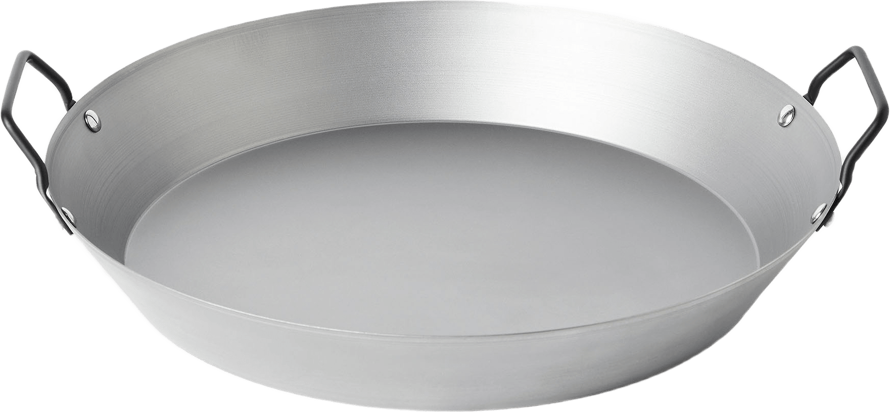 Paellapanna i tåligt kolstål, perfekt för tillagning av den klassiska spanska maträtten, med två rejäla handtag för smidig hantering och servering.