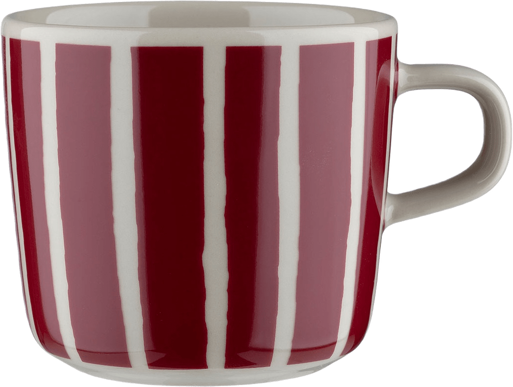 The Oiva coffee cup features the Piccolo pattern decal and it is dishwasher, oven, microwave, and freezer safe.