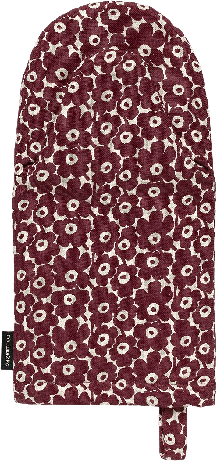 The Pikkuinen Unikko pattern oven mitten is printed in Helsinki. It has a padded filling and a hanging loop.