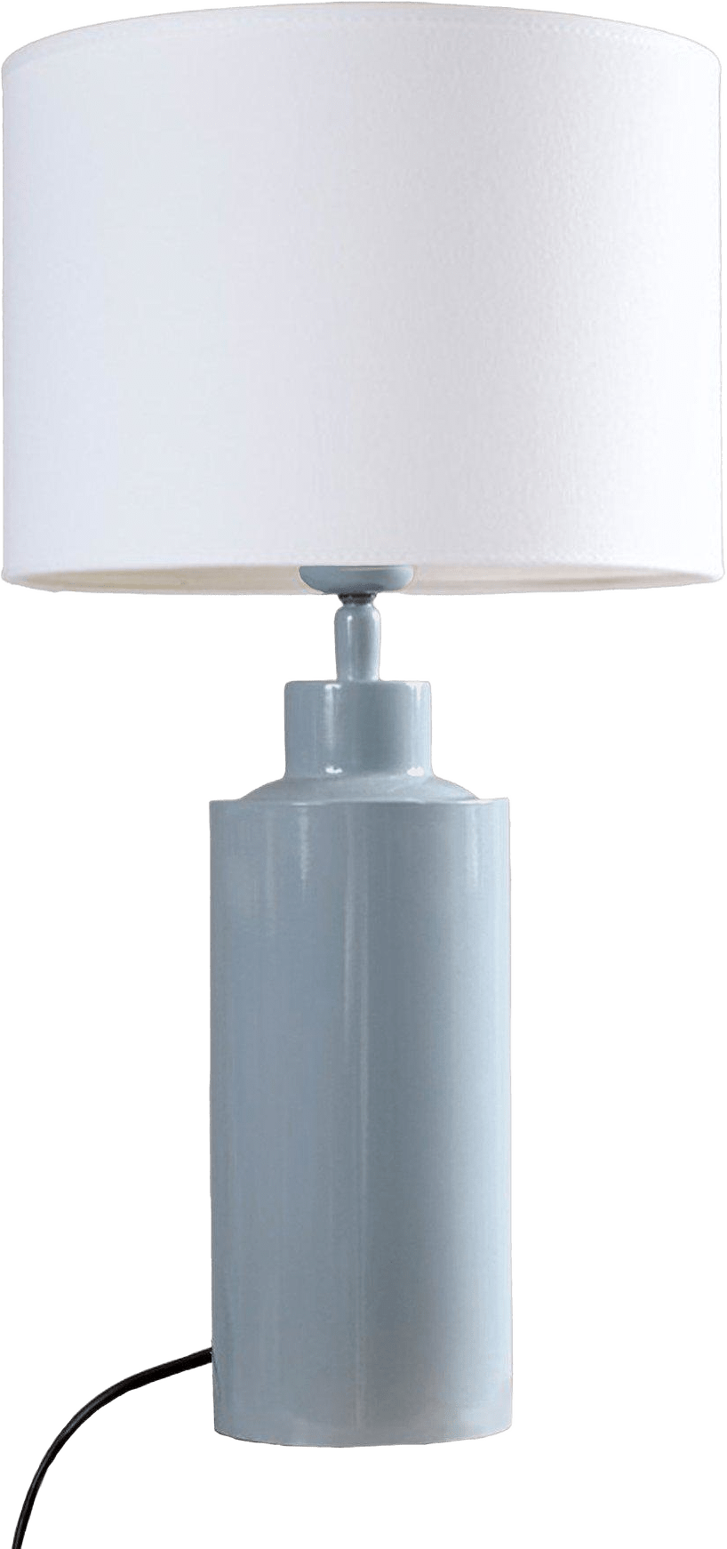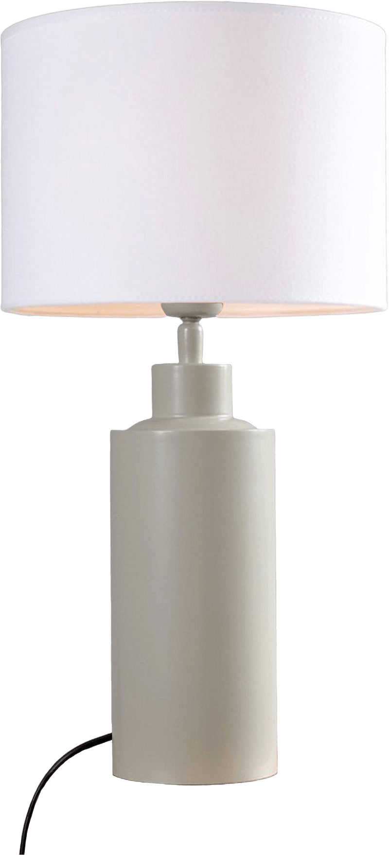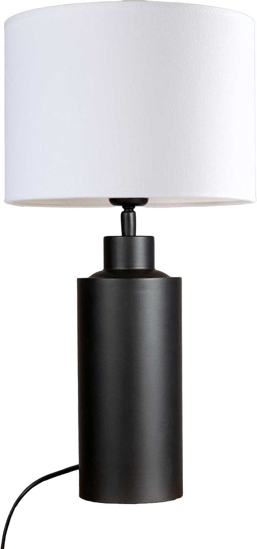 Solo lampfot med en cylinderformad vit tygskärm. Skärmens är 25cm i diameter och 25cm hög. Lampfotens höjd är 32cm och den totala höjden inklusive skärm blir 55cm. Svart plastsladd 170cm med strömbrytare. E27 sockel. Ledad lamphållare. E27 sockel. Max 40W. IP 20. Ljuskälla köpes separat.