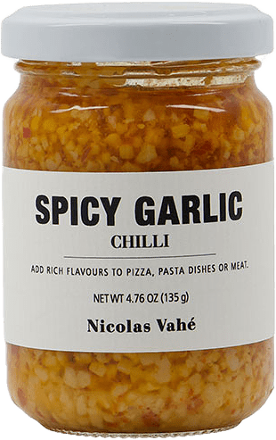 Spicy garlic, chilli 135 g. Hackad vitlök och chilivitlök 54%, olivolja 21%, solrosolja 21%, Glödhet chilipeppar 2.5%, salt, citronsyre. Energi kJ: 1362g, Energi kcal:330g, Fett:32g - Varav mättade fettsyror:5,2g, Kolhydrater:6,7g - Varav sockerarter:2,4g, Kostfibrer:3,9g, Protein:3g, Salt: 3gDenna produkt har ännu inga recensioner.