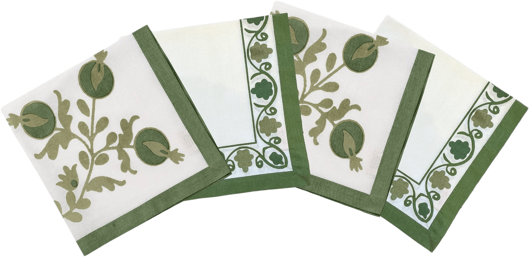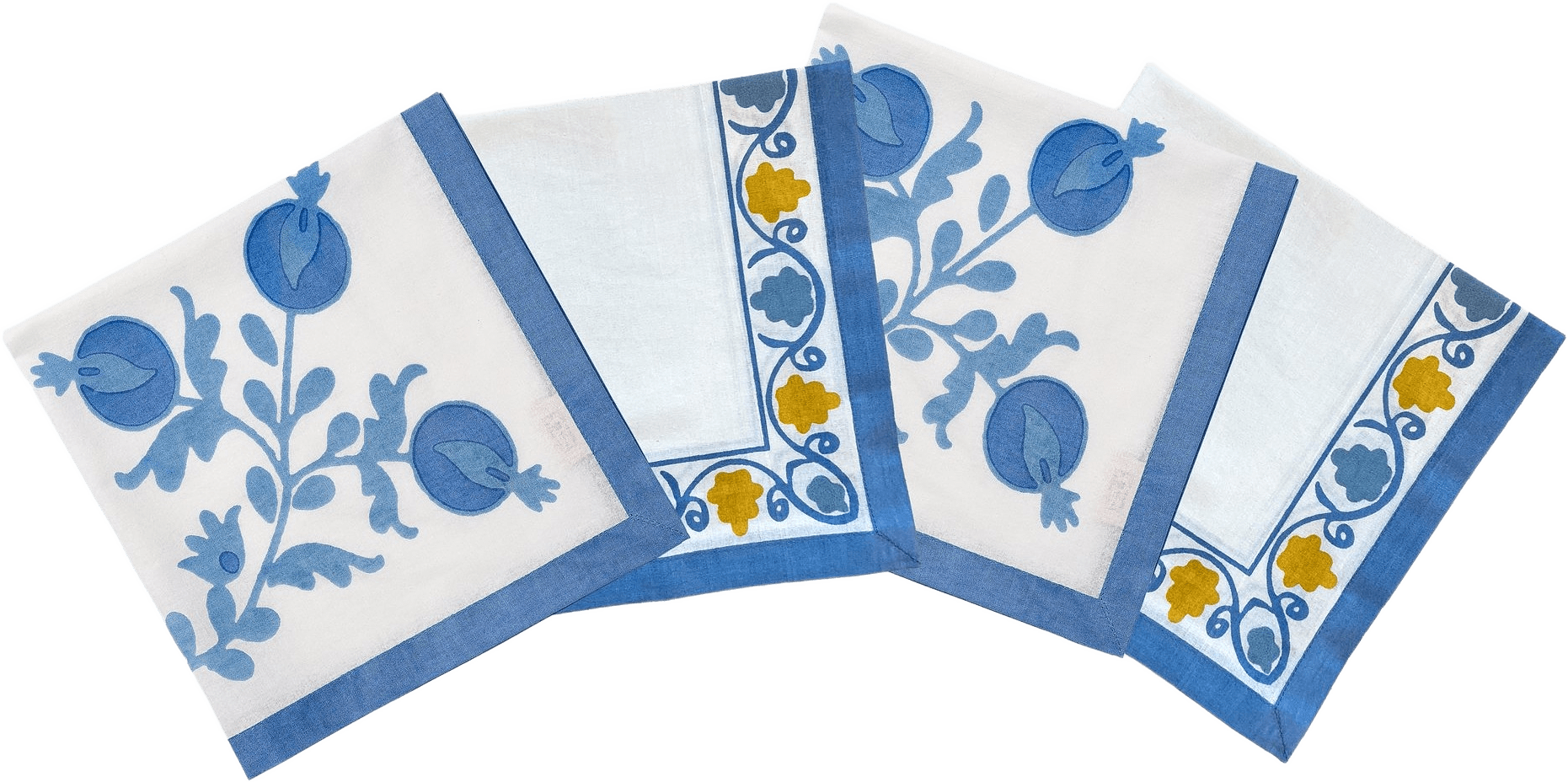 Våra servetter Suzani adderar färg och hantverk till din dukning. Inspirerade av traditionella folkmönster och handtryckta i Jaipur. Med kombinationen av nordisk nostalgi och indiskt hantverk skapar servetterna en unik dukning som passar både till vardag och fest. Servetterna säljs i 4-pack, med två varianter av mönstret i varje, och är perfekta för att skapa en färgglad och charmig känsla vid det dukade bordet.