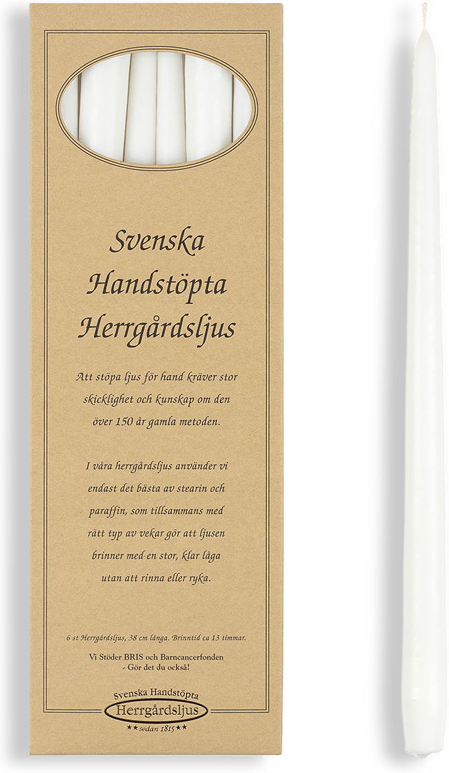 Ljusen är 38 cm långa och har en brinntid på ca 13 timmar. De ligger i en fin presentförpackning med 6 ljus i varje ask.