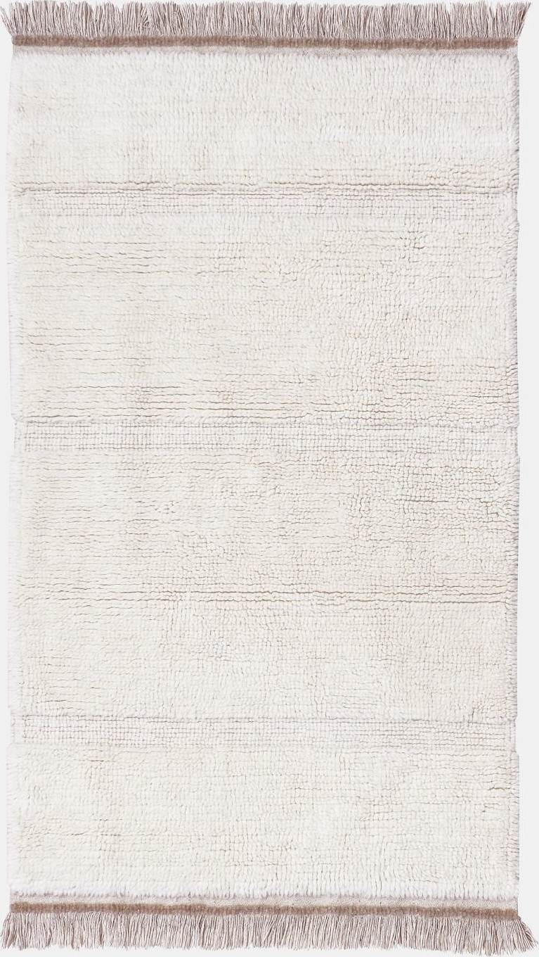 Rektangulär matta som kombinerar mjuk kort ull med horisontella rader med extra kort ull, somskapar ett subtilt mönster. Avslutat i kanterna med en linje av kontrasterande färgade och korta fransar som kommer ut ur basen.