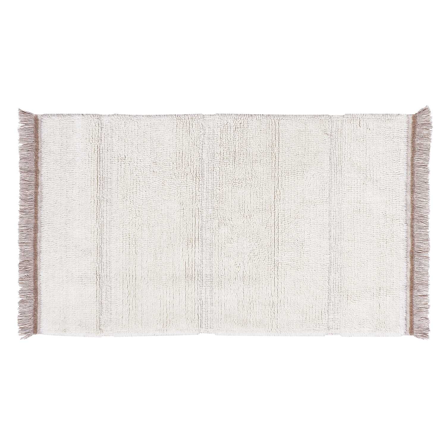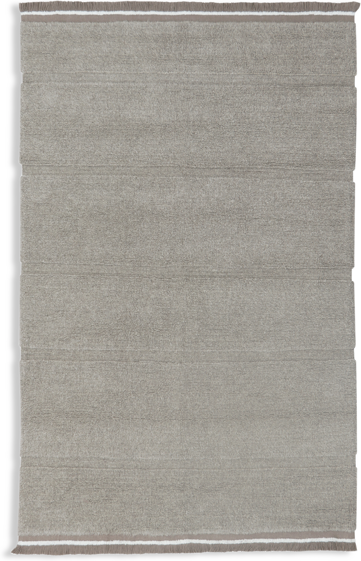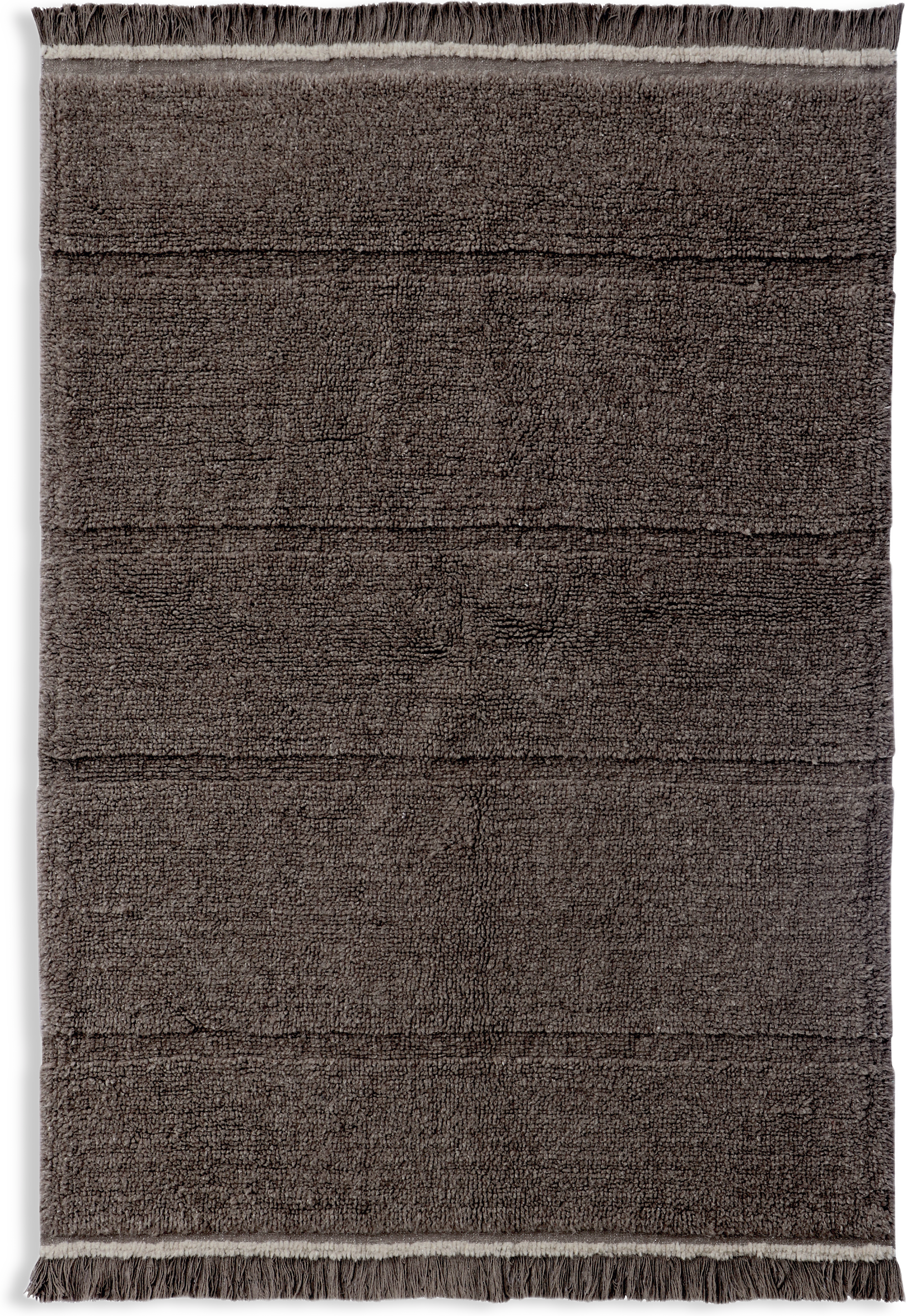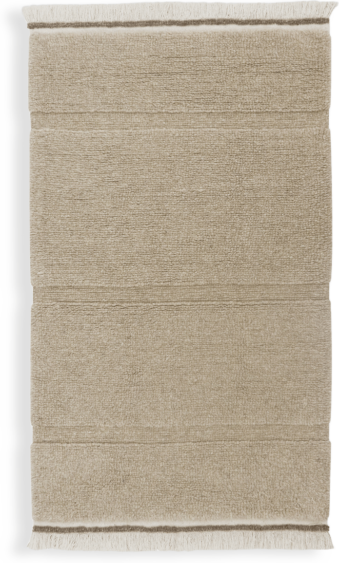 Rektangulär matta som kombinerar mjuk kort ull med horisontella rader med extra kort ull, somskapar ett subtilt mönster. Avslutat i kanterna med en linje av kontrasterande färgade och korta fransar som kommer ut ur basen.
