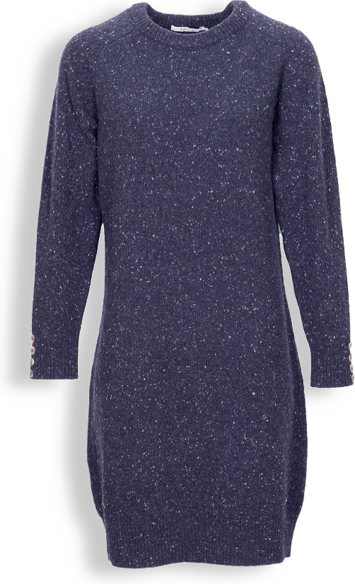 Högalid dress är en stickad klänning i värmande nyull/polyamid mix. Klänningen med sitt mjuka garn får ett tweed utseende med inslag av olika färger i garnet. Ärmarna är försedda med fina knappar i återvunnet papper och plast. Högalid klänning har en rakare passform. Rygglängd ca 96 cm i storlek M. Damstorlekar.