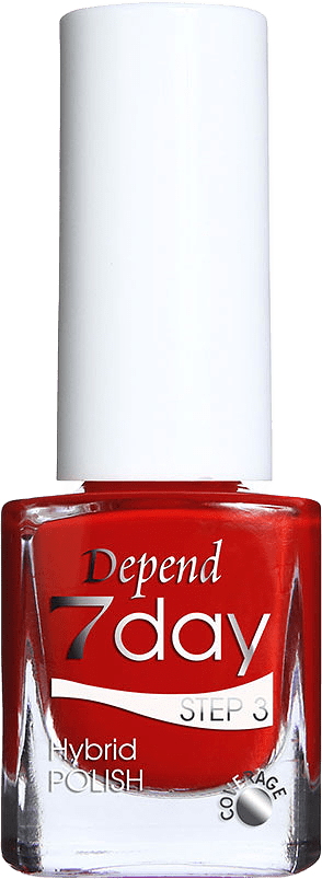 När du applicerar Depend 7day BASE, POLISH och TOP gör du alltid alla 10 naglarna i en följd. 1. Rengör naglarna med Depend 7day CLEANSER. Vänta 30 sek så att ytan är helt torr. 2. Applicera 7day Protecting BASE på alla naglarna. Börja på lillfinger (från höger eller vänster). 3. Därefter kan du direkt applicera det första lagret av 7day Hybrid POLISH. Vänta för säkerhets skull 30 sekunder innan lager 2 av Hybrid POLISH appliceras. Vänta även här 30 sekunder extra innan du applicerar 7day Hybrid TOP. 4. Du avslutar med att applicera Hybrid TOP i två lager. Vänta 3 min innan du applicerar sista lagret av Hybrid TOP. Efter 5 min är 7day-behandlingen torr så att du kan vidröra lackytan. Hela behandlingen tar 15-20 min beroende på hur van du är vid att lacka.