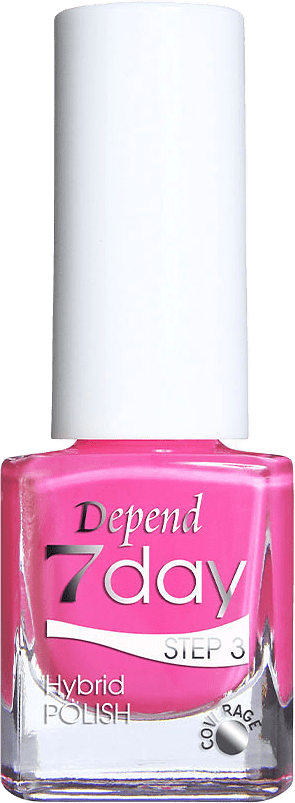 När du applicerar Depend 7day BASE, POLISH och TOP gör du alltid alla 10 naglarna i en följd. 1. Rengör naglarna med Depend 7day CLEANSER. Vänta 30 sek så att ytan är helt torr. 2. Applicera 7day Protecting BASE på alla naglarna. Börja på lillfinger (från höger eller vänster). 3. Därefter kan du direkt applicera det första lagret av 7day Hybrid POLISH. Vänta för säkerhets skull 30 sekunder innan lager 2 av Hybrid POLISH appliceras. Vänta även här 30 sekunder extra innan du applicerar 7day Hybrid TOP. 4. Du avslutar med att applicera Hybrid TOP i två lager. Vänta 3 min innan du applicerar sista lagret av Hybrid TOP. Efter 5 min är 7day-behandlingen torr så att du kan vidröra lackytan. Hela behandlingen tar 15-20 min beroende på hur van du är vid att lacka.