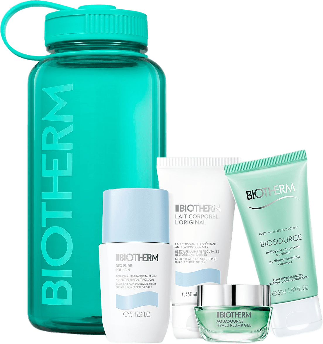 Biosource Purifying Foaming Cleanser: Fukta ansiktet med rent vatten. Fördela gelén i handflatan och arbeta upp ett lödder med vatten. Massera försiktigt in i ansiktet med cirkulära rörelser (undvik ögonen) och skölj sedan av rikligt med ljummet vatten. Aquasource Hyalu Plump Gel: placera en dos av Aquasource Hyalu Plump Gel i handflatan. Använd båda händerna för att jämna ut över hela ansiktet. Avsluta med halsen och dekolletaget för intensiv återfuktning. Undvik ögonkonturerna. För att fullborda rutinen, smörj in kroppen med Lait Corporel L'Original Body Milk och massera in. Används efter dusch på torr hud. Applicera deodoranten i armhålan.