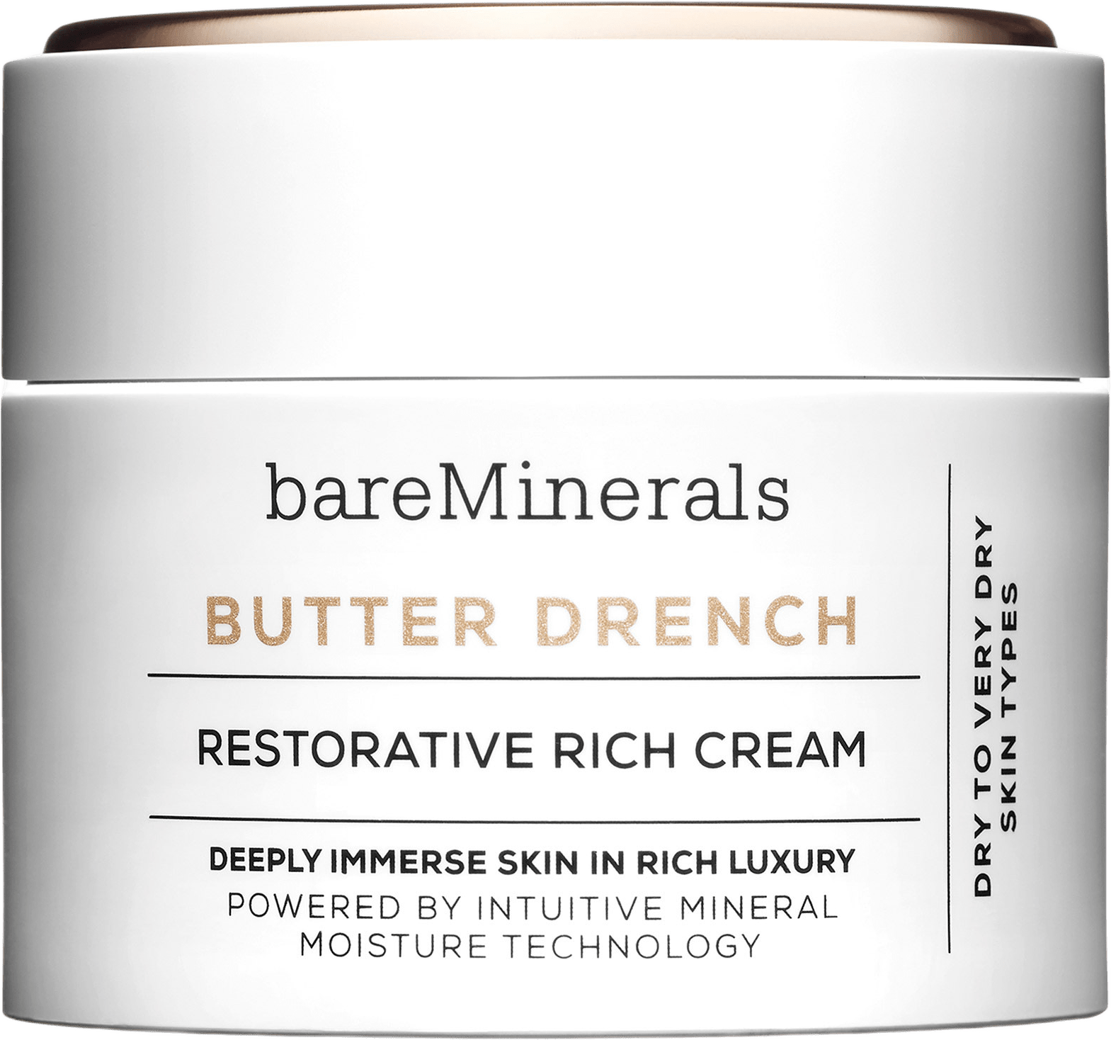 Water (Aqua/Eau), Glycerin, Butylene Glycol, Dimethicone, Pentaerythrityl Tetraethylhexanoate, Propanediol, Tricaprylin, Glyceryl Stearate SE, Cetyl Alcohol, Silica, Myristyl Myristate, PEG-100 Stearate, Butyrospermum Parkii (Shea) Butter, Copernicia Cerifera (Carnauba) Wax (Cera Carnauba/Cire De Carnauba), Hydrogenated Polyisobutene, Hydrogenated Polydecene, Behenyl Alcohol, Dimethylacrylamide/Sodium Acryloyldimethyltaurate Crosspolymer, Isostearic Acid, Stearyl Alcohol, Urea, Glucosamine HCL, Algae Extract, Saccharomyces Cerevisiae Extract, Sodium PCA, Allantoin, Ethylhexylglycerin, Lauryl Betaine, Sodium Citrate, Disodium EDTA, Sorbitan Tristearate, Phytosteryl/Octyldodecyl Lauroyl Glutamate, Alcohol, Citric Acid, Carbomer, Polysorbate 20, Sodium Hyaluronate, Hypericum Erectum Extract, Palmitoyl Tetrapeptide-7, Palmitoyl Tripeptide-1, Ceramide NP, Tocopherol, Fragrance (Parfum), Geraniol, Limonene, Linalool, Citral, Sodium Benzoate, PhenoxyethanolbareMinerals Butter Drench Restorative Rich Cream