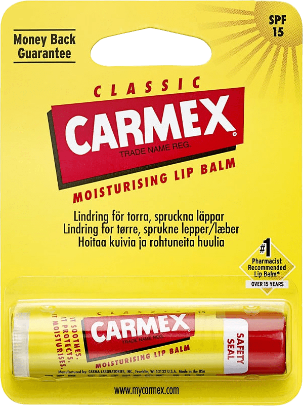 Petrolatum, Lanolin, Euphorbia Cerifera Cera, Ethylhexyl Methoxycinnamate, Benzophenone-3, Ozokerite, Cetyl Esters, Theobroma Cacao Seed Butter, Cera Alba, Paraffin, Camphor, Menthol, Salicylic Acid , Vanillin, Hydroxycitronellal, Limonene, Linalool, Geraniol, Citronellol.Carmex Classic Lip Balm Stick