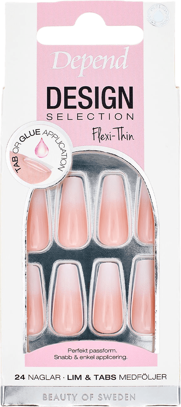 Flexibla lösnaglar med perfekt passform. Varje lösnagel är numrerad så att du enkelt vet vilken lösnagel som passar till din naturliga nagel. Förberedelser: 1. Prova ut alla storlekar och fila till någon nagel om det behövs. Om du inte hittar en lösnagel med perfekt passform välj då en som är något större och fila till kanterna. 2. Gör en grundlig manikyr – fila ner och forma dina naglar. Tryck försiktigt tillbaka dina nagelband med en manikyrpinne. Använd även en poleringsfil för att jämna till nagelytan. Tips: använd Depend nagelbandspeeling för att få bort att alla döda hudceller som finns längs nagelbanden och på din nagel så får du en bättre hållbarhet på dina lösnaglar. 3. Rengör dina naglar med en aceton- och oljefri nagellackremover, vi rekommenderar Depend blå nagellackremover. Låt torka ordentligt. Tvätta inte händerna med tvål och vatten då fästytan blir försämrad. Applicering med lim: 1. Skydda ytor mot eventuellt spill innan limtuben öppnas. Avlägsna kapsylen, håll limtuben upprätt och vrid av vingen för att öppna limmet. OBS: Tuben är en engångsförpackning och kan inte återförslutas. Lägg därför inte den öppna tuben ned, då limrester kan läcka ut. 2. Applicera ett tunt lager lim över hela ytan av lösnageln som kommer i kontakt med din naturliga nagel. OBS! Var försiktig så att du inte får lim på nagelbandet. 3. Sätt bakkanten av lösnageln nära intill nagelbandet och vik långsamt ner lösnageln mot din egen nagel så att limmet hinner fördela sig över hela nageln, detta för att minimera luftbubblor. Tryck ordentligt i 5-10 sekunder. Försiktighetsåtgärder för lim: Om hudens ytor klistras fast, dra ej utan använd en acetonbaserad remover. Använd aldrig lösnaglar om dina naturliga naglar är tunna, skadade eller infekterade. Undvik hetta. Nagellim kan fläcka eller skada tyg. Skydda ytor mot eventuellt spill innan limmet öppnas. Avlägsna kapsylen, håll limtuben upprätt och vrid av vingen för att öppna limmet. OBS: Tuben är en engångsförpackning och kan inte återförslutas. Lägg därför inte den öppna tuben ned, då limrester kan läcka ut. Applicering med tabs (dubbelhäftande nageltejp): 1. Välj en tab som passar din naturliga nagel. Den ska täcka så stor nagelyta som möjligt utan att nå huden. 2. Lyft upp arkets tunna skyddsfilm och lossa en tab. Håll taben i plastfliken och fäst den på din nagel genom att trycka den noggrant på plats. Tag bort skyddsplasten genom att dra i fliken. 3. Sätt bakkanten av lösnageln nära intill nagelbandet och vik långsamt ner lösnageln mot din egen nagel. Pressa nageln på plats i 10-15 sekunder. Tips: Gör ett finger i taget. Undvik kontakt med vatten den första timmen efter applicering. OBS! Vi rekommenderar max 10 dagars användning av lösnaglar i sträck. Sedan skall naglarna luftas innan en ny applicering kan göras, förutsatt att dina naglar då är i god kondition. Vid borttagning av lösnaglar använd Depend Lösnagelremover. OBS! Bryt eller drag aldrig av lösnageln eftersom det kan skada din naturliga nagel.