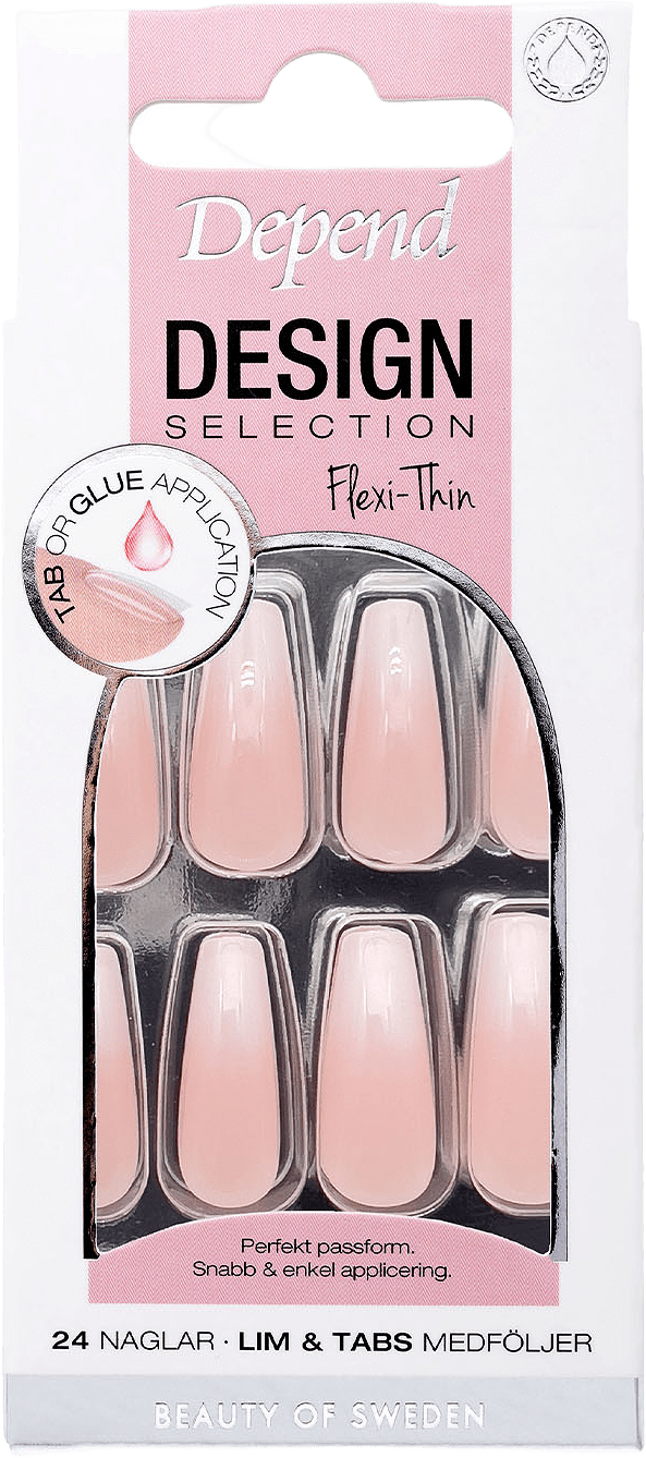 Flexibla lösnaglar med perfekt passform. Varje lösnagel är numrerad så att du enkelt vet vilken lösnagel som passar till din naturliga nagel. Förberedelser: 1. Prova ut alla storlekar och fila till någon nagel om det behövs. Om du inte hittar en lösnagel med perfekt passform välj då en som är något större och fila till kanterna. 2. Gör en grundlig manikyr – fila ner och forma dina naglar. Tryck försiktigt tillbaka dina nagelband med en manikyrpinne. Använd även en poleringsfil för att jämna till nagelytan. Tips: använd Depend nagelbandspeeling för att få bort att alla döda hudceller som finns längs nagelbanden och på din nagel så får du en bättre hållbarhet på dina lösnaglar. 3. Rengör dina naglar med en aceton- och oljefri nagellackremover, vi rekommenderar Depend blå nagellackremover. Låt torka ordentligt. Tvätta inte händerna med tvål och vatten då fästytan blir försämrad. Applicering med lim: 1. Skydda ytor mot eventuellt spill innan limtuben öppnas. Avlägsna kapsylen, håll limtuben upprätt och vrid av vingen för att öppna limmet. OBS: Tuben är en engångsförpackning och kan inte återförslutas. Lägg därför inte den öppna tuben ned, då limrester kan läcka ut. 2. Applicera ett tunt lager lim över hela ytan av lösnageln som kommer i kontakt med din naturliga nagel. OBS! Var försiktig så att du inte får lim på nagelbandet. 3. Sätt bakkanten av lösnageln nära intill nagelbandet och vik långsamt ner lösnageln mot din egen nagel så att limmet hinner fördela sig över hela nageln, detta för att minimera luftbubblor. Tryck ordentligt i 5-10 sekunder. Försiktighetsåtgärder för lim: Om hudens ytor klistras fast, dra ej utan använd en acetonbaserad remover. Använd aldrig lösnaglar om dina naturliga naglar är tunna, skadade eller infekterade. Undvik hetta. Nagellim kan fläcka eller skada tyg. Skydda ytor mot eventuellt spill innan limmet öppnas. Avlägsna kapsylen, håll limtuben upprätt och vrid av vingen för att öppna limmet. OBS: Tuben är en engångsförpackning och kan inte återförslutas. Lägg därför inte den öppna tuben ned, då limrester kan läcka ut. Applicering med tabs (dubbelhäftande nageltejp): 1. Välj en tab som passar din naturliga nagel. Den ska täcka så stor nagelyta som möjligt utan att nå huden. 2. Lyft upp arkets tunna skyddsfilm och lossa en tab. Håll taben i plastfliken och fäst den på din nagel genom att trycka den noggrant på plats. Tag bort skyddsplasten genom att dra i fliken. 3. Sätt bakkanten av lösnageln nära intill nagelbandet och vik långsamt ner lösnageln mot din egen nagel. Pressa nageln på plats i 10-15 sekunder. Tips: Gör ett finger i taget. Undvik kontakt med vatten den första timmen efter applicering. OBS! Vi rekommenderar max 10 dagars användning av lösnaglar i sträck. Sedan skall naglarna luftas innan en ny applicering kan göras, förutsatt att dina naglar då är i god kondition. Vid borttagning av lösnaglar använd Depend Lösnagelremover. OBS! Bryt eller drag aldrig av lösnageln eftersom det kan skada din naturliga nagel.