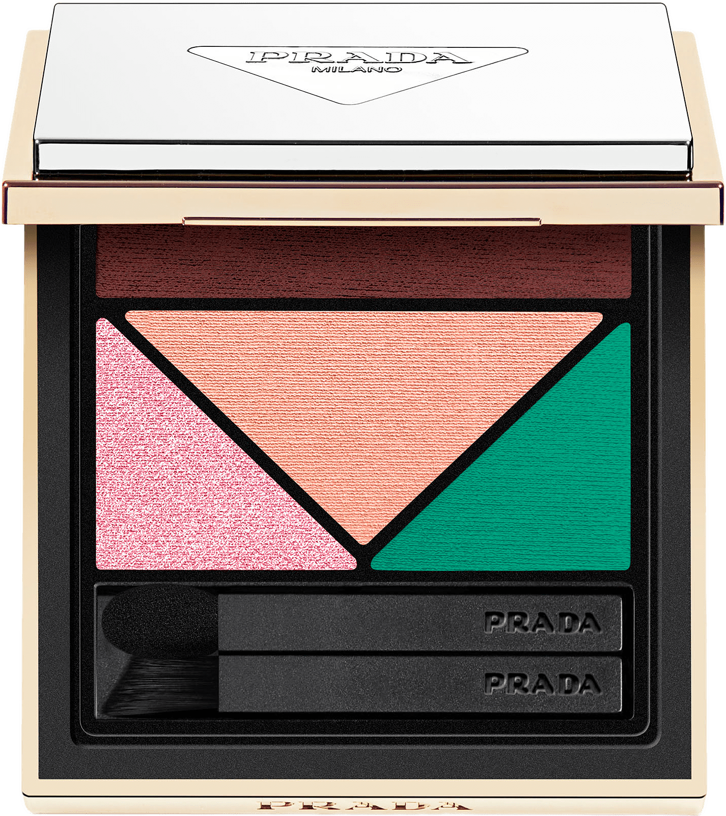 För en lättburen look, börja med att linjera ögonen med den hypermatta nyansen. För extra intensitet kan du använda den fuktad. Highlighta inre ögonvrån med metalfolienyansen. Den är väldigt krämig, lättblandad och smular inte. Applicera den mjukt matta nyansen i yttre ögonvrån. Växla från en lättburen till en vågad look med ett enda drag. PÅFYLLNINGSBAR Prada Dimensions refill är designad för att kunna fyllas på och möjliggör 75 % mindre förpackningsanvändning jämfört med att återköpa en hel ögonskuggspalett. HUR MAN PÅFYLLER 1. Tryck på triangeln på baksidan av paletten för att mata ut refillen 2. Dra av skyddsfilmen från tejpen på baksidan av den nya refillen. 3. Fäst den nya refillen i din Prada-palett genom att trycka försiktigt.