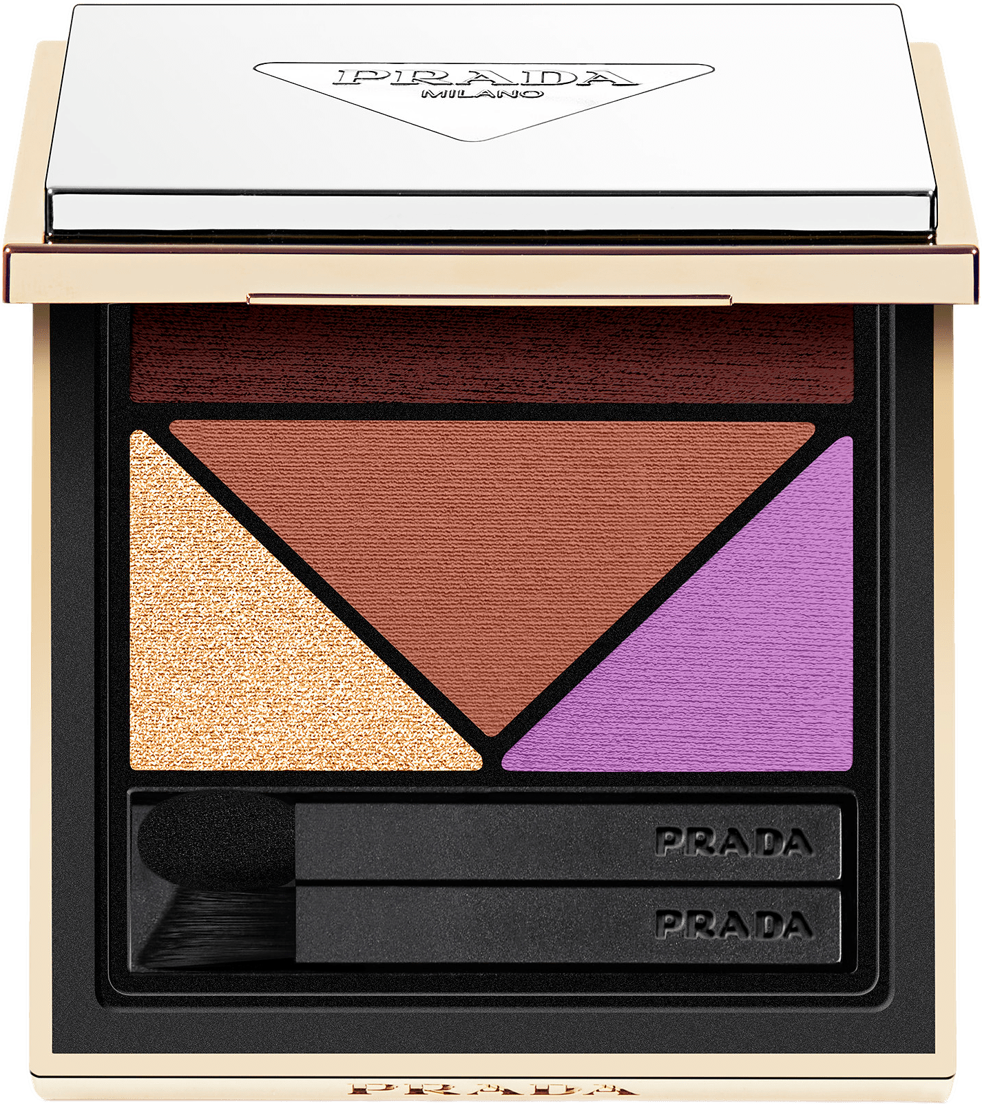 För en lättburen look, börja med att linjera ögonen med den hypermatta nyansen. För extra intensitet kan du använda den fuktad. Highlighta inre ögonvrån med metalfolienyansen. Den är väldigt krämig, lättblandad och smular inte. Applicera den mjukt matta nyansen i yttre ögonvrån. Växla från en lättburen till en vågad look med ett enda drag. PÅFYLLNINGSBAR Prada Dimensions refill är designad för att kunna fyllas på och möjliggör 75 % mindre förpackningsanvändning jämfört med att återköpa en hel ögonskuggspalett. HUR MAN PÅFYLLER 1. Tryck på triangeln på baksidan av paletten för att mata ut refillen 2. Dra av skyddsfilmen från tejpen på baksidan av den nya refillen. 3. Fäst den nya refillen i din Prada-palett genom att trycka försiktigt.
