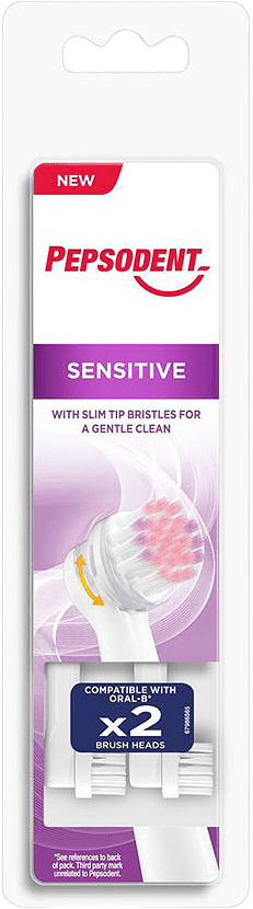 Nya Pepsodent Sensitive elektriskt tandborsthuvud är utvecklat för känsliga tänder och munnar. Med extra mjuka och 0,1mm tunna borstståtoppar, ger den dig en grundlig men skonsam rengöring av dina tänder och tandkött