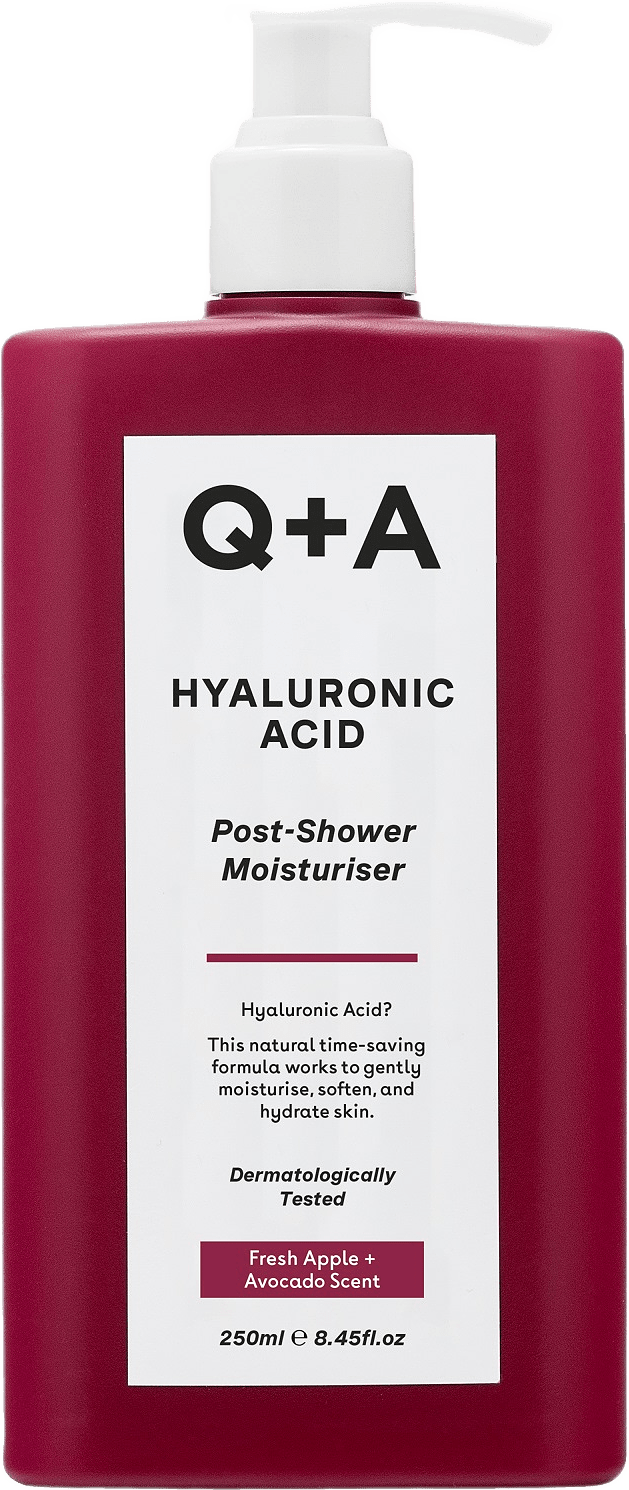Hyaluronic Acid Wet Skin Moisturiser från Q+A är en fuktighetskräm med hyaluronsyra som ger huden ultimat fuktighet. Den är designad för att användas direkt efter duschen. Den absorberar lätt in i huden samtidigt som den låser in långvarig fuktighet för att göra huden mjuk och omedelbart återfuktad. Formulerad med djupt närande avokado-, hasselnötoljor och hudvänliga prebiotika för en lugnande fuktboost. Fuktighetskrämen har en frisk doft av äpple och avokado.