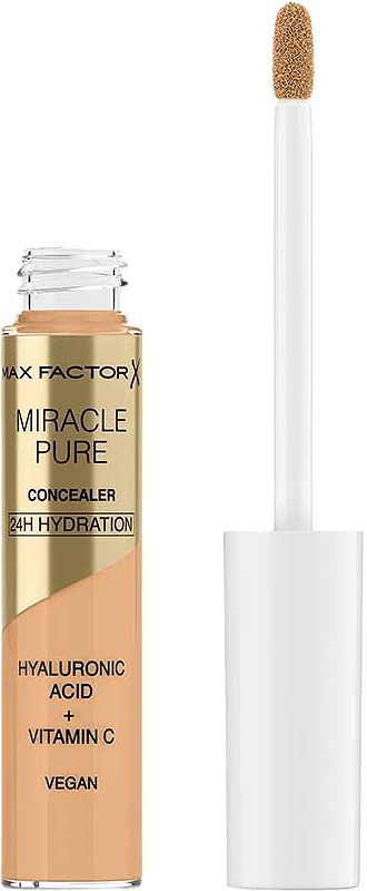 Aqua/Water/Eau, Dicaprylyl Carbonate, Dicaprylyl Ether, Aluminum Starch Octenylsuccinate, Glycerin, Trimethylsiloxysilicate, Sodium Chloride, Silica, Tri(Polyglyceryl-3/Lauryl) Hydrogenated Trilinoleate, Stearalkonium Bentonite, Cetyl Peg/Ppg-10/1 Dimethicone, Mica, Propylene Carbonate, Tocopherol, Panthenol, Triethoxycaprylylsilane, Sodium Benzoate, Chlorphenesin, Glyceryl Polymethacrylate, Peg-8, Methicone, Ascorbyl Palmitate, Sodium Hyaluronate, Pantolactone, Palmitoyl Hexapeptide-12, Pentaerythrityl Tetra-Di-T-Butyl Hydroxyhydrocinnamate, [May Contain/Peut Contenir/+/-:Titanium Dioxide (CI 77891), Iron Oxides (CI 77491, CI 77492, CI 77499)].Max Factor Miracle Pure Concealer