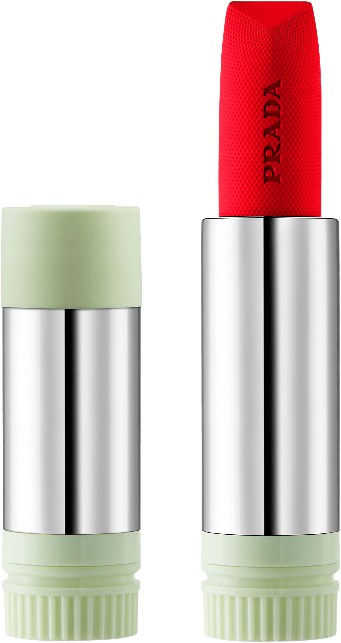 Den triangulära stiftformen säkerställer enkel applicering genom god kontroll och definition, vilket ger intensiva pigment med ett enda drag och en sofistikerad finish. För diffusa matta läppar, välj Prada Monochrome Soft Matte. Håll i läppstiftets fyrkantiga Prada-ring för kontrollerad applicering. Börja med amorbågen och fyll sedan i läpparna. Färgen är superbyggbar. Som ett tips kan du blanda ut den på kinderna för en naturlig rouge-effekt. Lär dig hur du fyller på din Prada Monochrome Soft Matte i två enkla steg: 1. Håll i Pradas fyrkantiga ring, klicka ut påfyllningen. 2. Klicka i den nya påfyllningen.