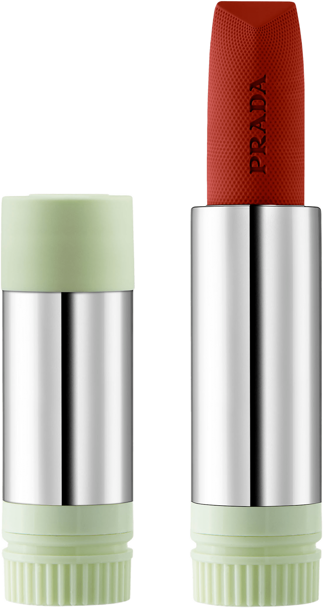 Den triangulära stiftformen säkerställer enkel applicering genom god kontroll och definition, vilket ger intensiva pigment med ett enda drag och en sofistikerad finish. För diffusa matta läppar, välj Prada Monochrome Soft Matte. Håll i läppstiftets fyrkantiga Prada-ring för kontrollerad applicering. Börja med amorbågen och fyll sedan i läpparna. Färgen är superbyggbar. Som ett tips kan du blanda ut den på kinderna för en naturlig rouge-effekt. Lär dig hur du fyller på din Prada Monochrome Soft Matte i två enkla steg: 1. Håll i Pradas fyrkantiga ring, klicka ut påfyllningen. 2. Klicka i den nya påfyllningen.