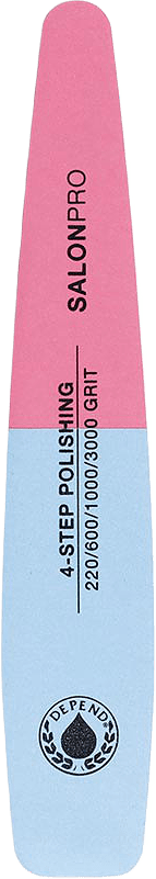 Fila till längden med den blå ytan, 220 grit. Rugga försiktigt upp nageln med den rosa ytan, 600 grit. Polera 15-20 sekunder med den grå ytan, 1000 grit. Blankpolera därefter med den vita ytan, 3000 grit för en blank slutfinish. Underhåll högglansen med polerytorna 1000 och 3000 grit.