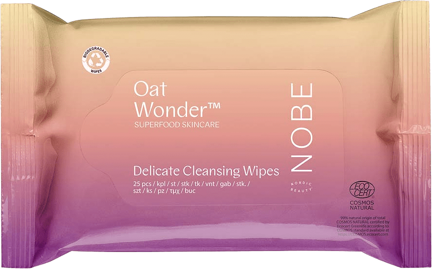 NOBE Oat Wonder® Delicate Cleansing Wipes är biologiskt nedbrytbara rengöringsservetter som varsamt, men enkelt rengör ansiktet och tar bort smink, vilket lämnar huden kännas ren, mjuk och lugnad. Formulerade med nordisk ekologisk havreolja, vårdar dessa servetter huden utan irritation. Nyckelingrediensen, havreolja från det finska livsmedelsföretaget Fazer, produceras från högkvalitativ havre skördad nära Fazers egen kvarn med hjälp av en CO2-extraktionsprocess. Havre har i århundraden betraktats som en superfood i Norden och är allmänt känt för att vara fördelaktigt för huden, särskilt havreolja — den är rik på fettsyror, vitamin E och ceramider, som vårdar, skyddar huden från fria radikaler och stärker hudbarriären. Dessutom har havreolja en effektiv lugnande effekt som minskar irritation och förhindrar att fukt avdunstar från huden. Kombinerat med djupt återfuktande glycerin samt barriärstärkande xylitol, ger dessa servetter en återfuktad och uppfriskad känsla för alla hudtyper. De är mättade med precis rätt mängd vätska, vilket säkerställer att de glider över ansiktet utan att behöva gnugga. Den återförslutbara förpackningen är perfekt för en hektisk livsstil, vilket gör dem bekväma att använda på gymmet, under resor eller för snabba touch-ups med smink. Produkten är certifierad COSMOS Natural av Ecocert och innehåller 99,10% ingredienser av naturligt ursprung. Användning: Torka försiktigt över ansiktet för att rengöra huden och ta bort smink. Kassera servetten i soporna. Återförslut förpackningen för att hålla servetterna fräscha. Lämplig för morgon och kväll.
