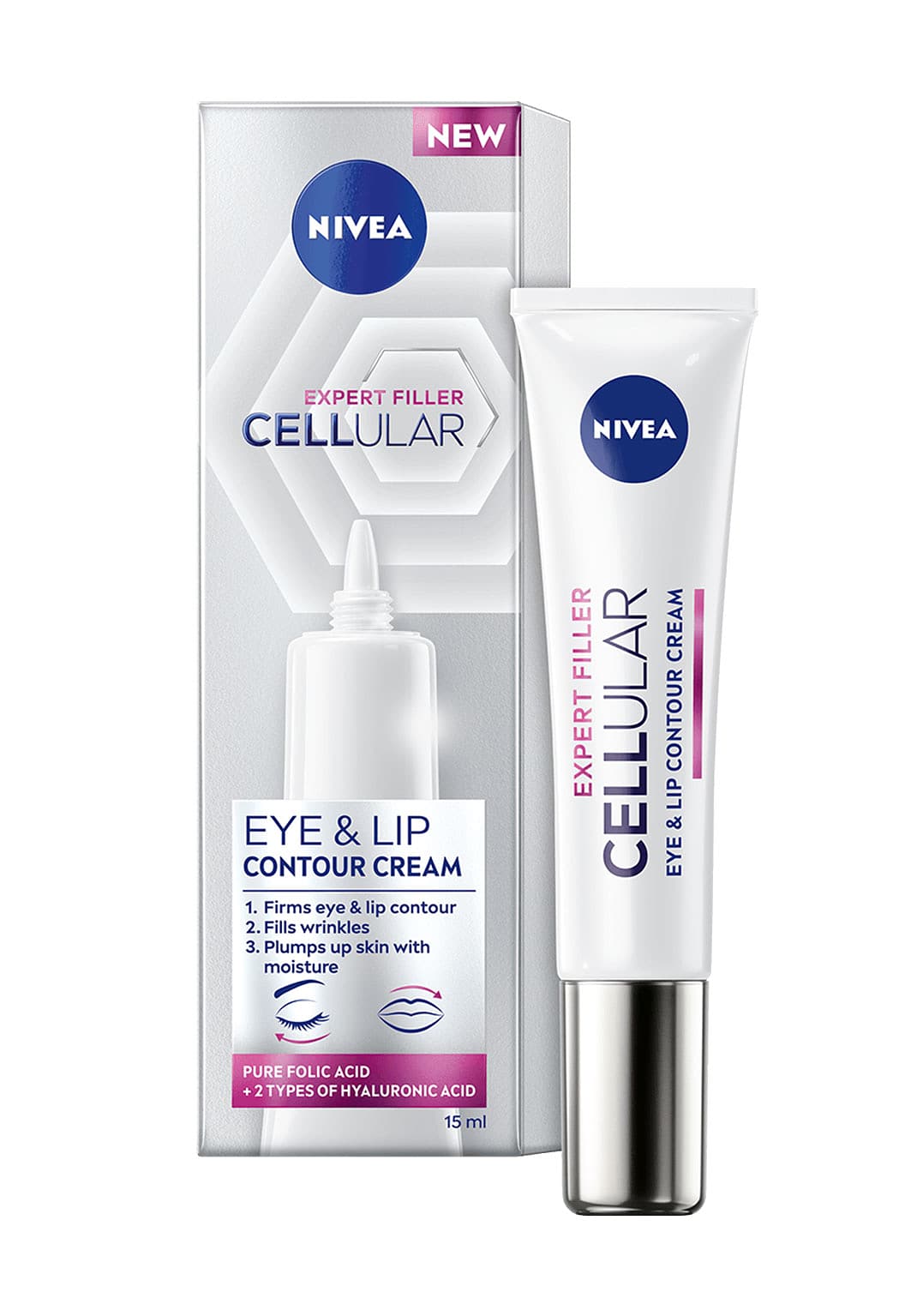NIVEA Cellular Expert Filler Eye Cream är en ögonkräm med en avancerad formula som innehåller en kombination av kraftfulla anti-age aktiva ämnen som ger en utfyllande effekt på 24 timmar (testad på hudceller) och motverkar förlust av fasthet i ögon- och läppområdet. Ren folsyra fyller cellerna med nytt liv och hjälper till att reparera för att främja fastare och fylligare hud. Mikro och Marko hyaluronsyra är 2 anti-age must-haves, kända för att effektivt fylla ut rynkor, jämna ut huden och intensivt återfukta. Formulerad med den högsta koncentrationen av hyaluronsyra i en NIVEA ögonkräm. Produkten snabbar på hudens egna regeneration och huden ser genast fräschare ut. Dermatologiskt och oftalmologiskt testad. Parfymfri och passar kontaktlinsbärare.