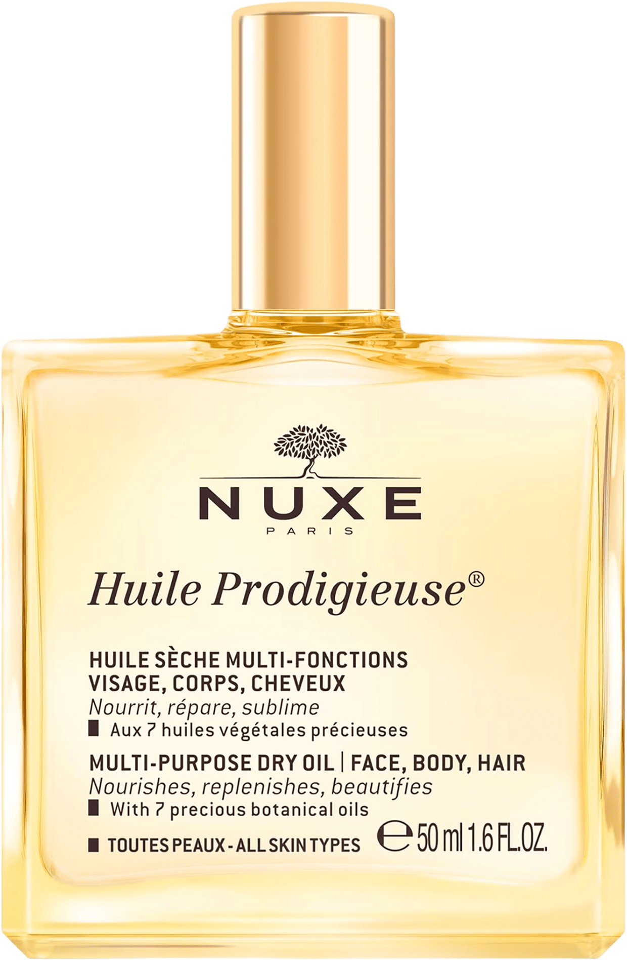 Arganolja – Reparerande Tsubakiolja – Mycket närande & anti-aging Hasselnötsolja – Lugnande Makadamianötolja – Närande Sötmandelolja – Mjukgörande Kameliaolja – Fuktgivande Gurkörtolja – Utslätande 2 former av E-vitamin – Antioxidant, motverkar för tidigt åldrande av huden.NUXE Prodigieuse Huile Prodigieuse