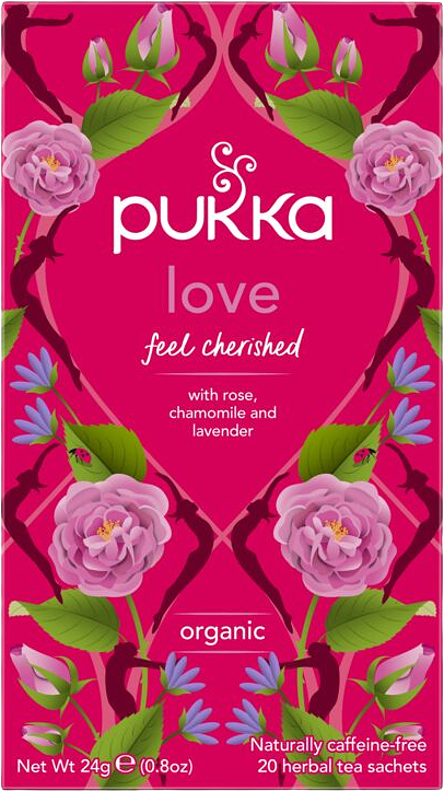 Naturligt koffeinfria, 100% ekologiskt odlade och etiskt producerade ingredienser: Kamomill (31%), ringblomma, fläderblom, lakritsrot, lindblomma, lavendelblomma (6%), ros (4%).Pukka Örtte Love EKO