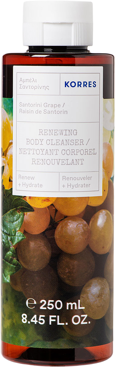 AQUA/WATER/ EAU, SODIUM LAURETH SULFATE, COCAMIDOPROPYL BETAINE, SODIUM COCOYL ISETHIONATE, PARFUM/ FRAGRANCE, COCO-GLUCOSIDE, GLYCERYL OLEATE, ALOE BARBADENSIS LEAF JUICE POWDER, ALTHAEA OFFICINALIS ROOT EXTRACT, ARGININE, CASTORYL MALEATE, CITRIC ACID, GLYCERIN, GUAR HYDROXYPROPYLTRIMONIUM CHLORIDE, HYDROLYZED WHEAT GLUTEN, LACTIC ACID, POLYQUATERNIUM-7, SODIUM GLUCONATE, TOCOPHEROL, VITIS VINIFERA FRUIT EXTRACT, BENZYL ALCOHOL, IMIDAZOLIDINYL UREA, PHENOXYETHANOL, POTASSIUM SORBATE, SODIUM BENZOATE, SODIUM DEHYDROACETATE, ANISE ALCOHOL, LIMONENE, LINALOOL.Korres Santorini Grape Shower Gel