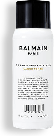Alcohol Denat, Dimethyl Ether, Octylacrylamide/Acrylates/Butylaminoethyl Methacrylate Copolymer, Acrylates Copolymer, Aminomethyl Propanol, Aqua, PEG-12 Dimethicone, Silk Amino Acids (Hydrolyzed Silk), Benzophenone-4, Panthenol, Imidazolidinyl Urea, Sodium Benzoate, Citric Acid, ParfumBALMAIN Paris Hair Couture Session Spray Strong