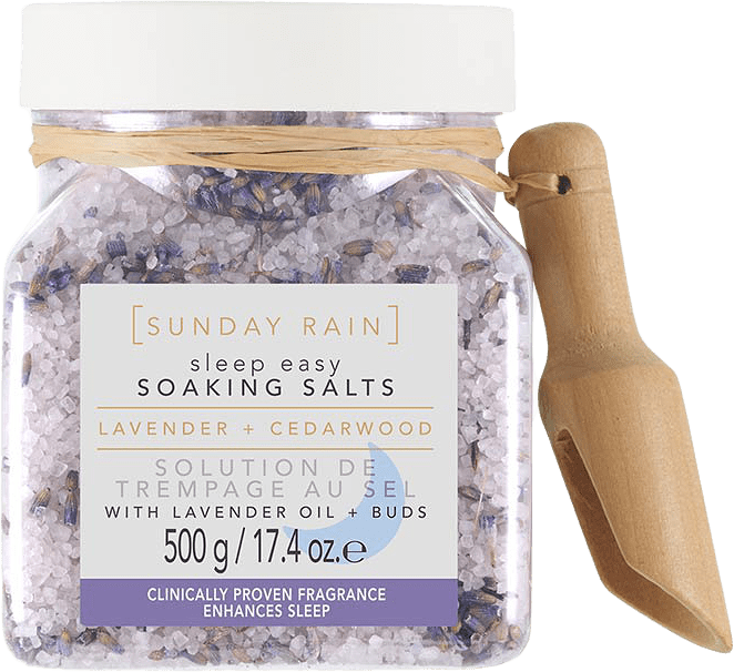Sodium Chloride, Glycerin, Lavandula Angustifolia (Lavender) Flower, Aqua (water, EAU), Lavandula Angustifolia (Lavender) Oil, Parfum (Fragrance), CI 17200 (Red 33), CI 42090 (Blue 1), Hexyl Cinnamal, LinaloolSunday Rain Sleep Easy Soaking Salts