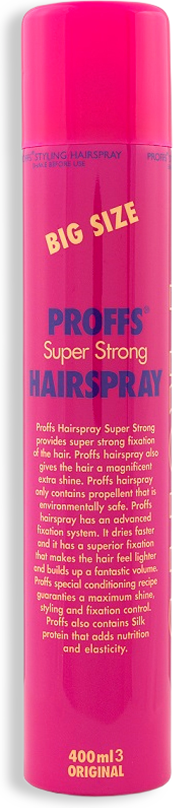 Alcohol Denat., Butane, Isobutane, Octylacrylamide/Acrylates/Butylaminoethyl Methacrylate Copolymer, Aqua, Propane, Aminomethyl Propanol, Diisopropyl Adipate, Tocopherol, Panthenol, Cocodimonium Hydroxypropyl Hydrolyzed Silk Amino Acids, Benzophenone-4, Citric Acid, Parfum.Proffs Super Strong Hairspray
