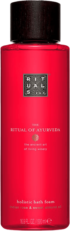 Aqua/Water, Sodium Laureth Sulfate, Disodium Laureth Sulfosuccinate, Cocamidopropyl Betaine, Glycerin, Parfum/Fragrance, Decyl Glucoside, Polysorbate 20, Prunus Amygdalus Dulcis (Sweet Almond) Oil, Rosa Damascena Flower Water, Coco-Glucoside, Glyceryl Oleate, Tocopherol, Hydrogenated Palm Glycerides Citrate, Sodium Chloride, Benzyl Benzoate, Citronellol, Coumarin, Hexyl Cinnamal, Linalool, Limonene, Sodium Benzoate, Potassium Sorbate, Sorbic Acid, Citric Acid, CI 17200 (Red 33).Rituals The Ritual of Ayurveda Bath Foam
