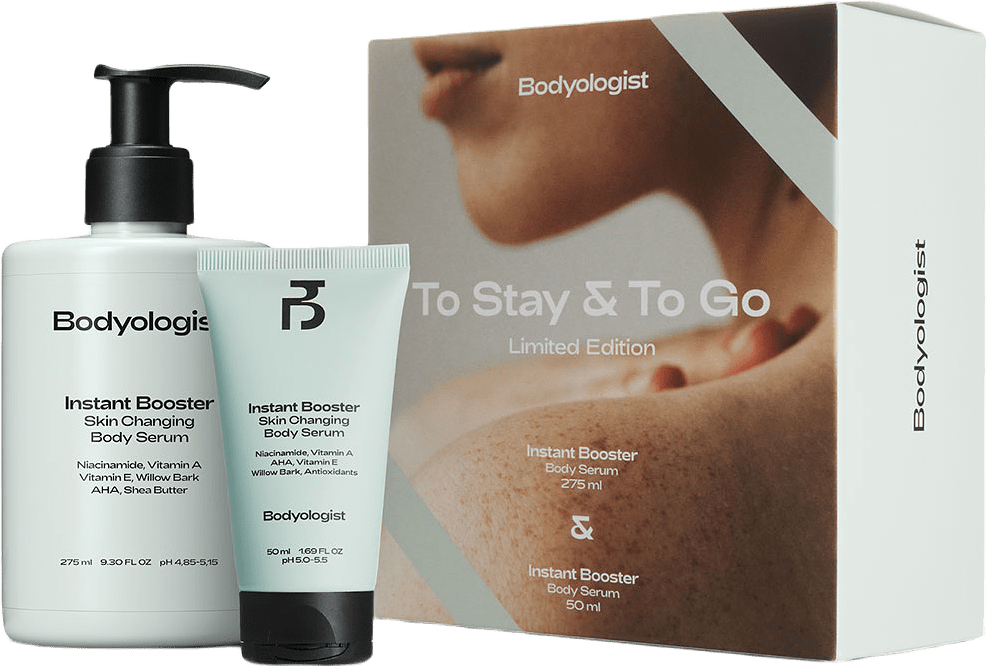 To Stay & To Go innehåller vår bästsäljare Instant Booster Body Serum i två olika storlekar, idealisk för både hemmet och resan.